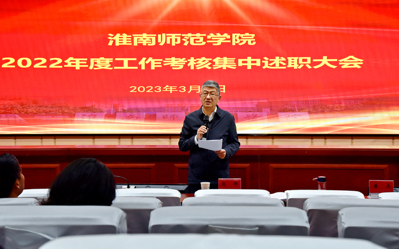 根据学校党委工作安排,2023年3月7日下午,淮南师范学院2022年度综合考核集中述职大会在知明湖学术报告厅举行,学校领导班子成员、全体中层干部、科级干部代表、教师代表、省级以上人大代表、政协委员,民主党派市级以上主委,校教代会执委参加会议。会议由学校党委书记阮爱民同志主持。