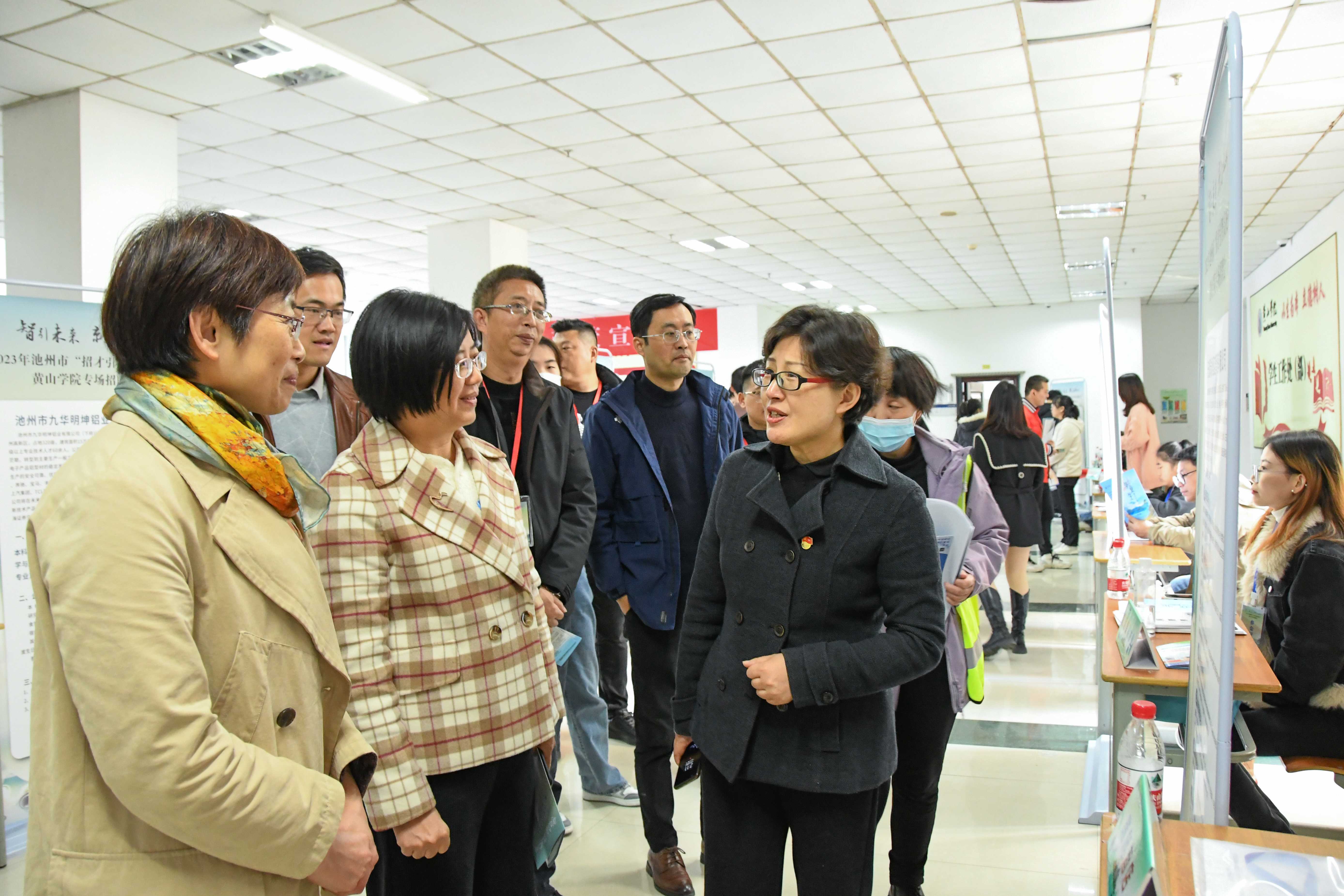 11月29日,2023年池州市“招才引智高校行”在我校举行。校党委副书记章文静,池州市人社局党组书记、局长林芳,学生处、机电工程学院、信息工程学院、化学化工学院等相关负责人出席此次活动。