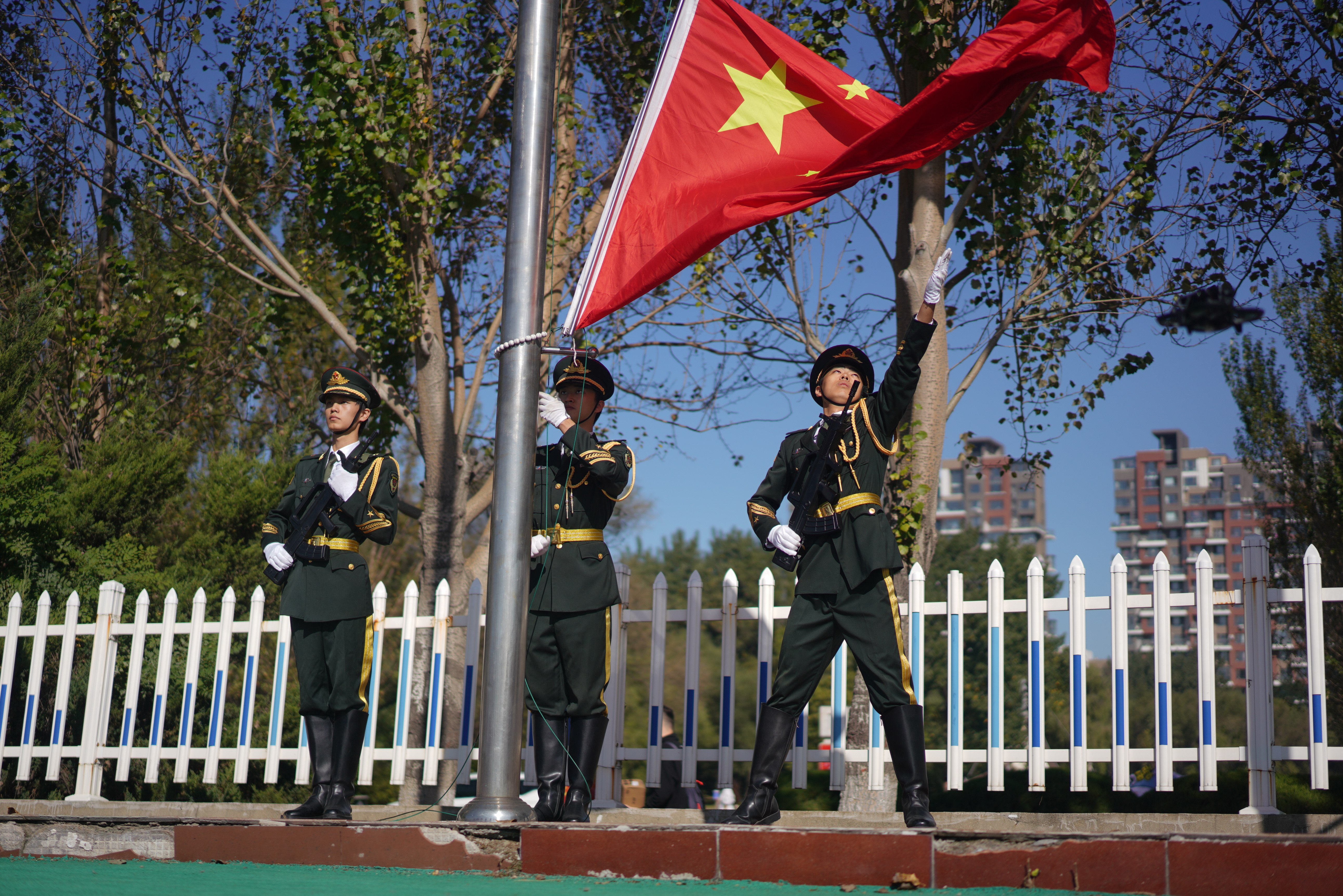 伴随着铿锵的《义勇军进行曲》奏响,五星红旗冉冉升起,大会在全体师生齐唱国歌中拉开序幕。