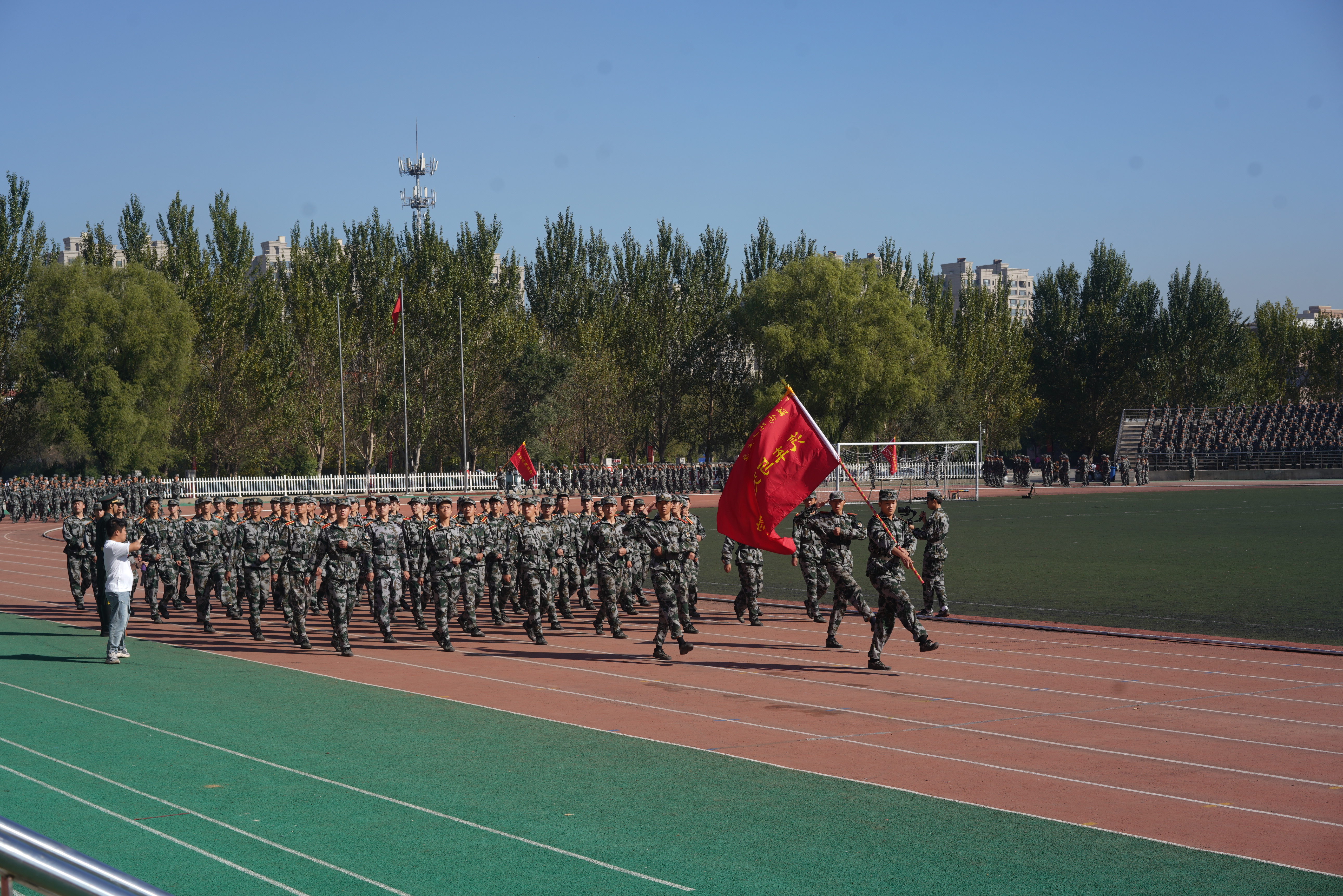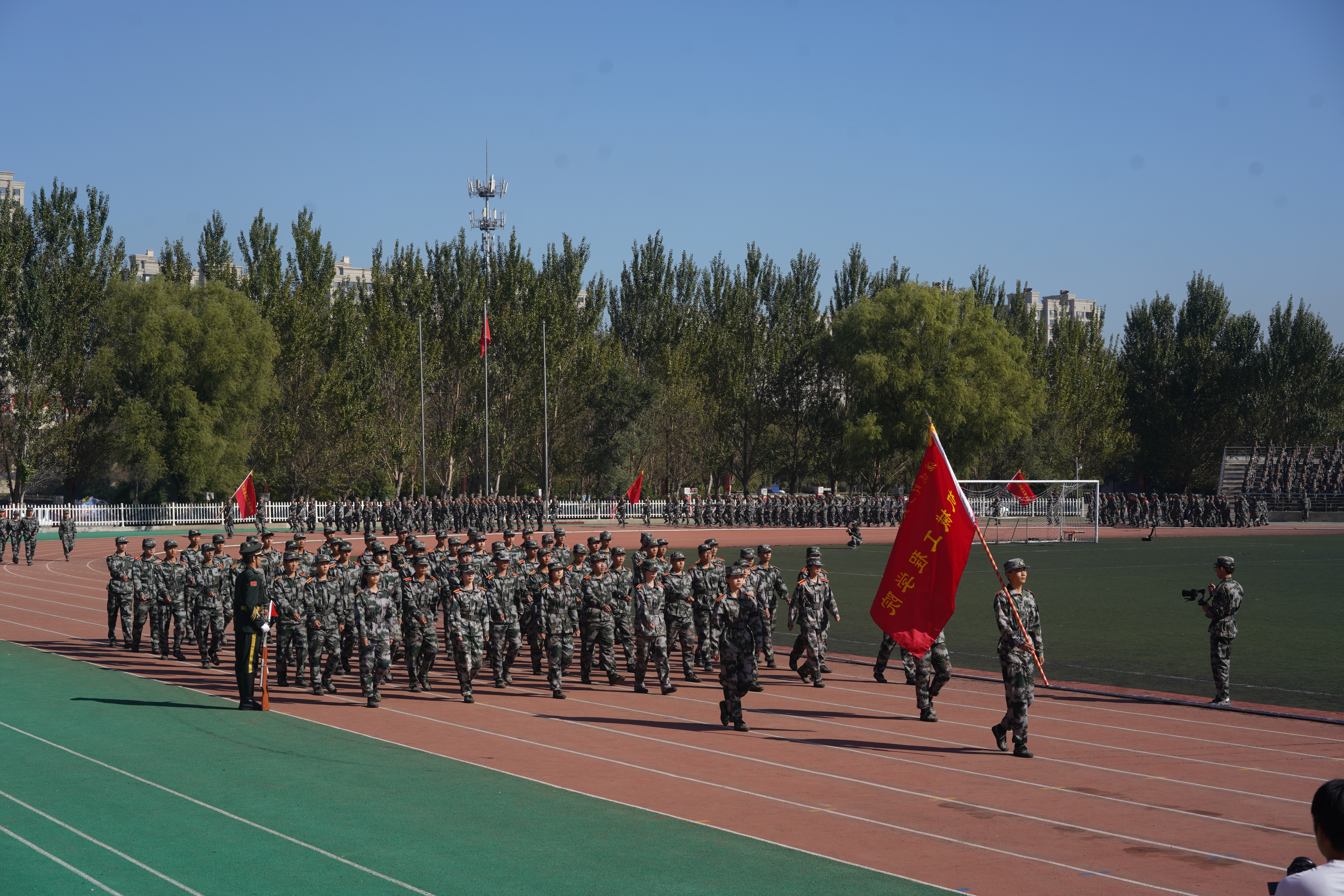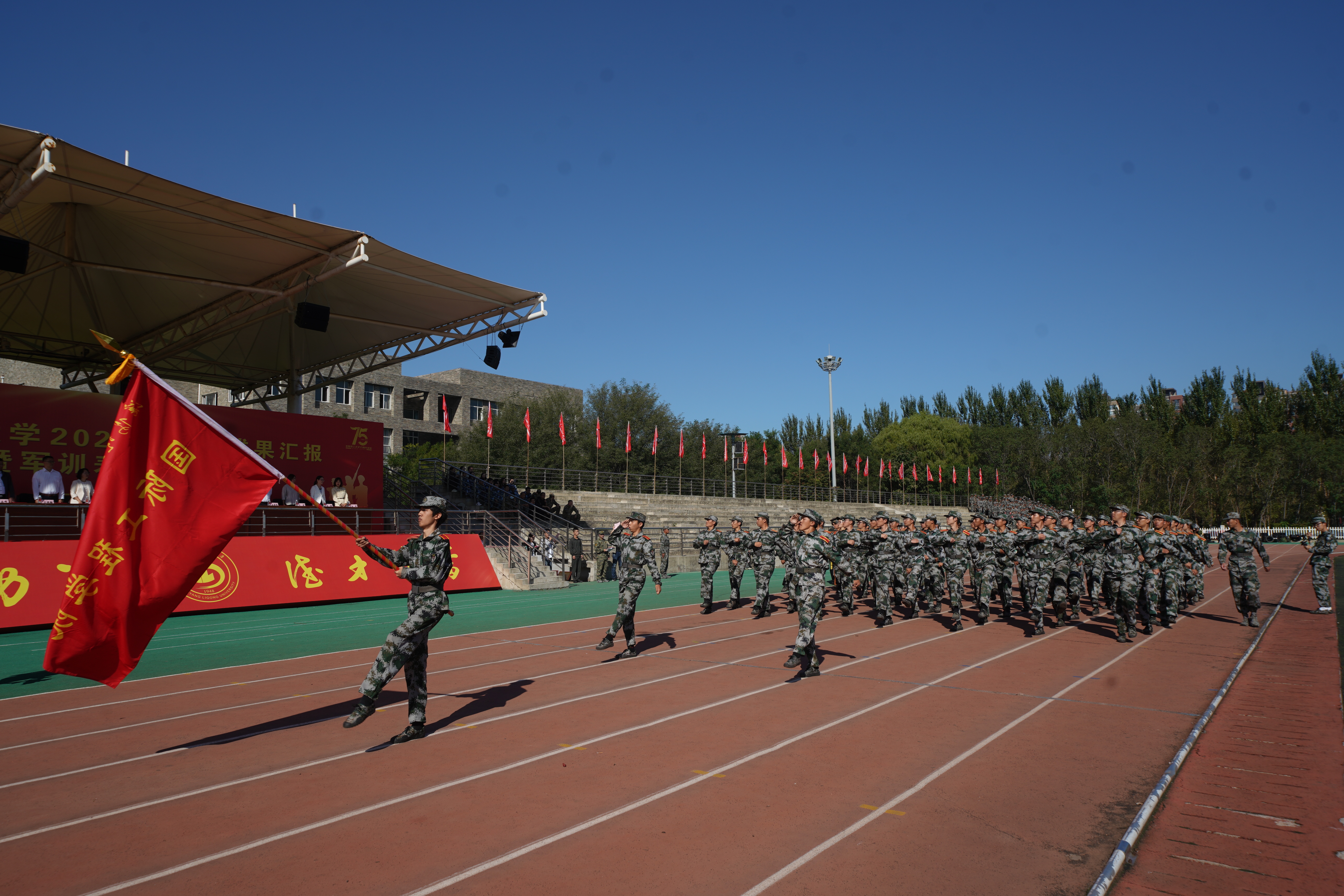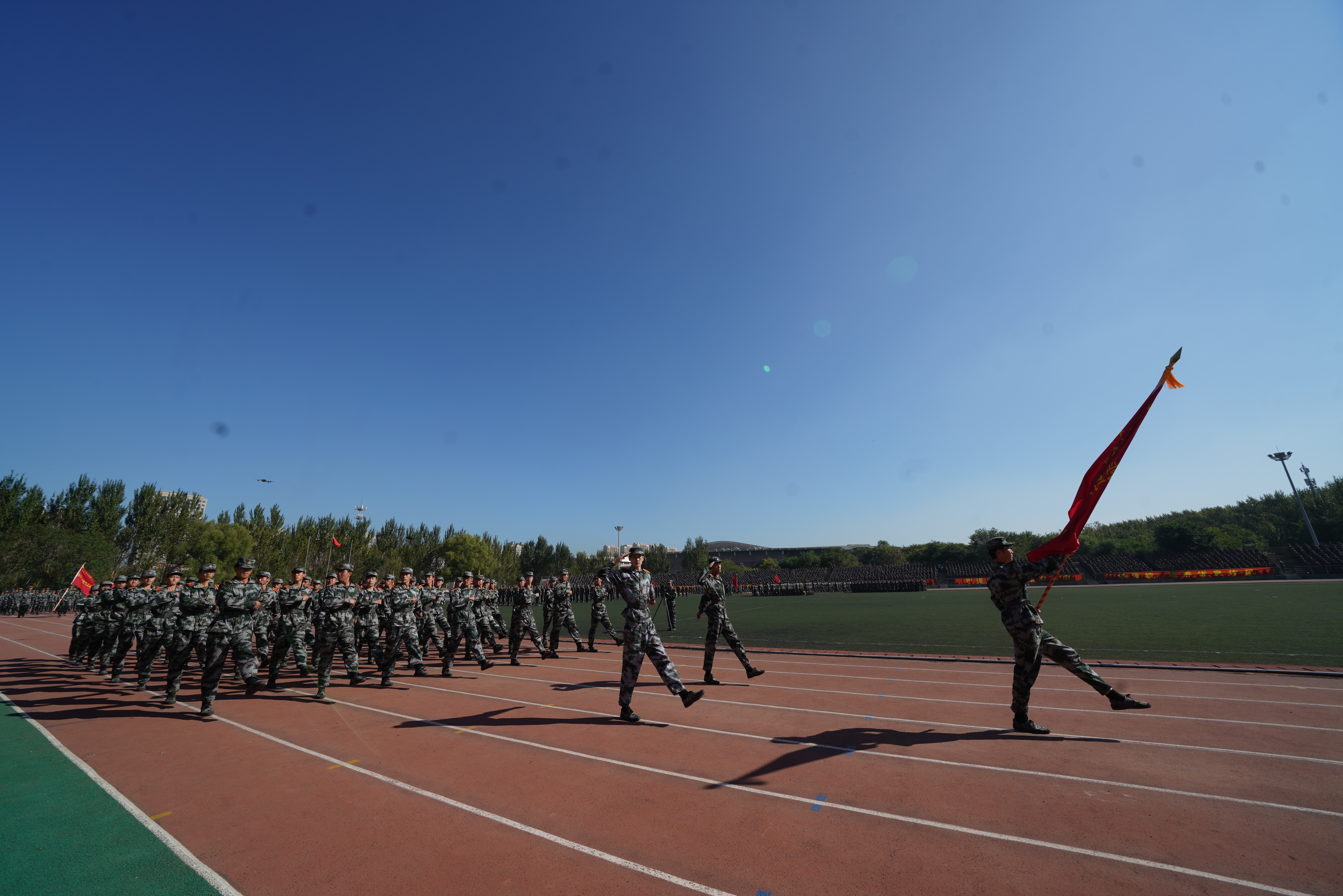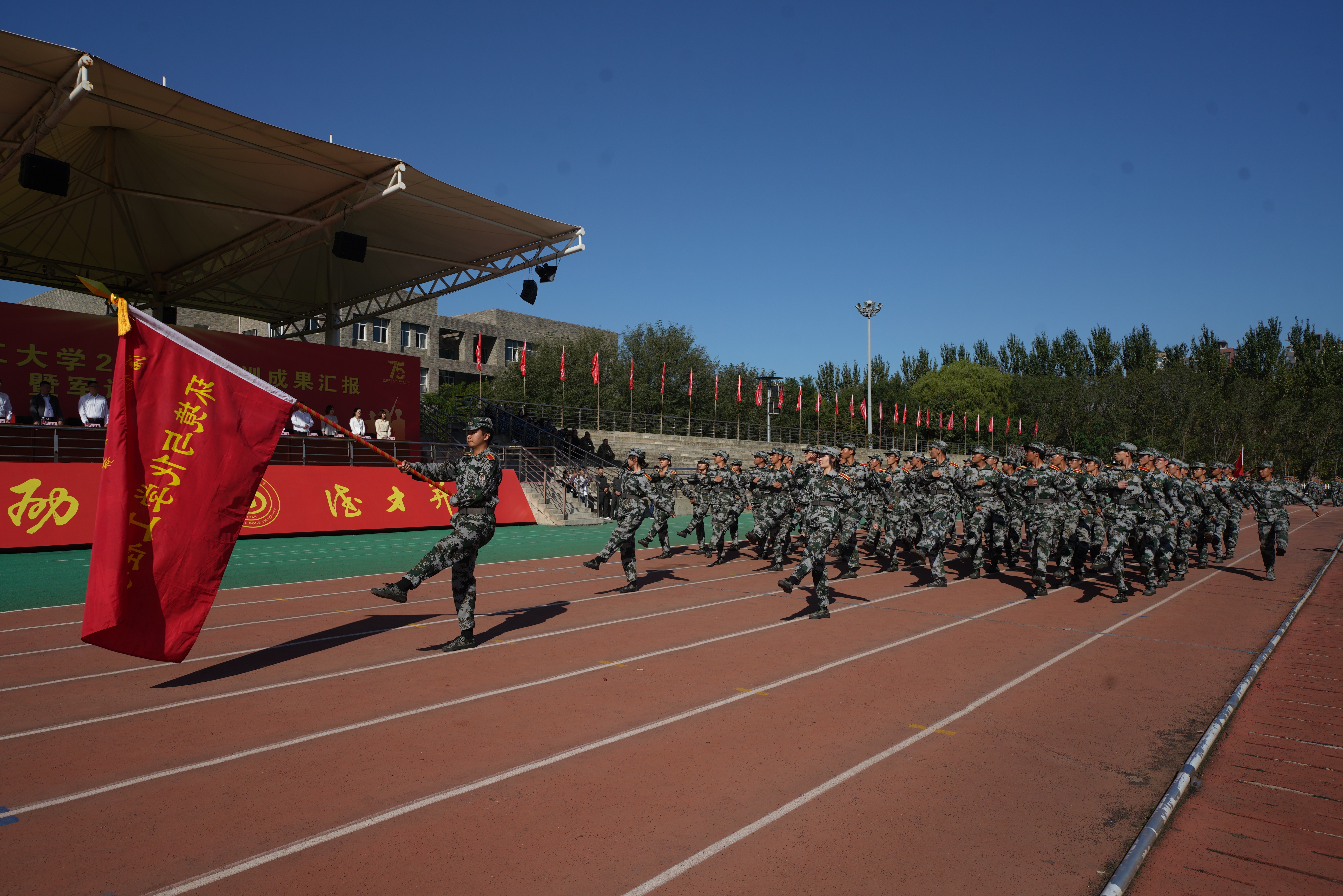 “迎军旗”,随着指挥员一声令下,国旗护卫队肩扛军旗走过方阵,十二个受阅连队伴随着雄壮的分列式进行曲,迈着矫健的步伐庄严地通过主席台,接受检阅。经过为期三周的军训磨砺,在受阅过程中参训学员目光坚定、军姿挺拔、斗志昂扬。一时间,龙翔体育场内步履铿锵、呼号阵阵,展现了兵工学子良好的精神风貌。随后,参训学员又汇报了“捕俘刀”和“战术对抗”科目的训练成果。