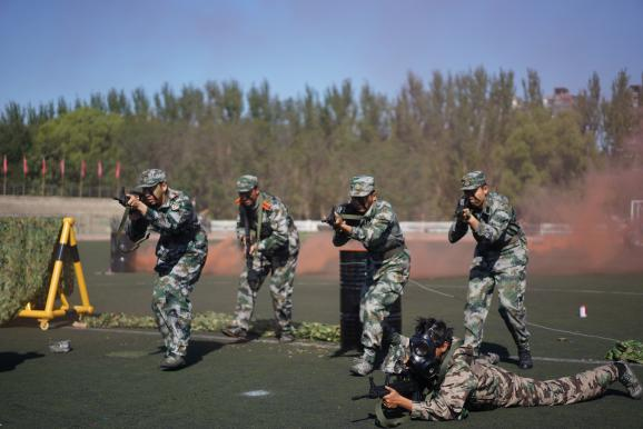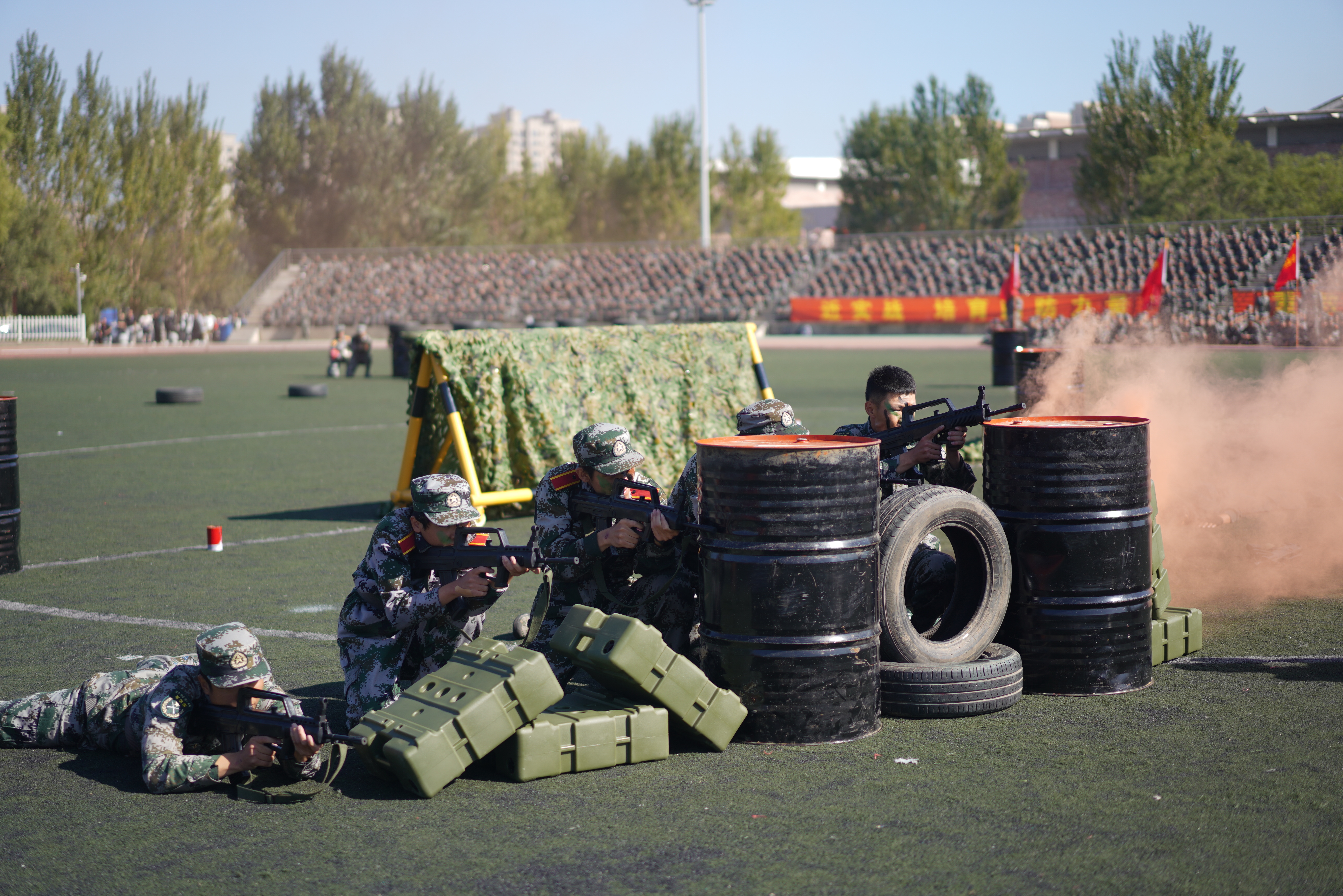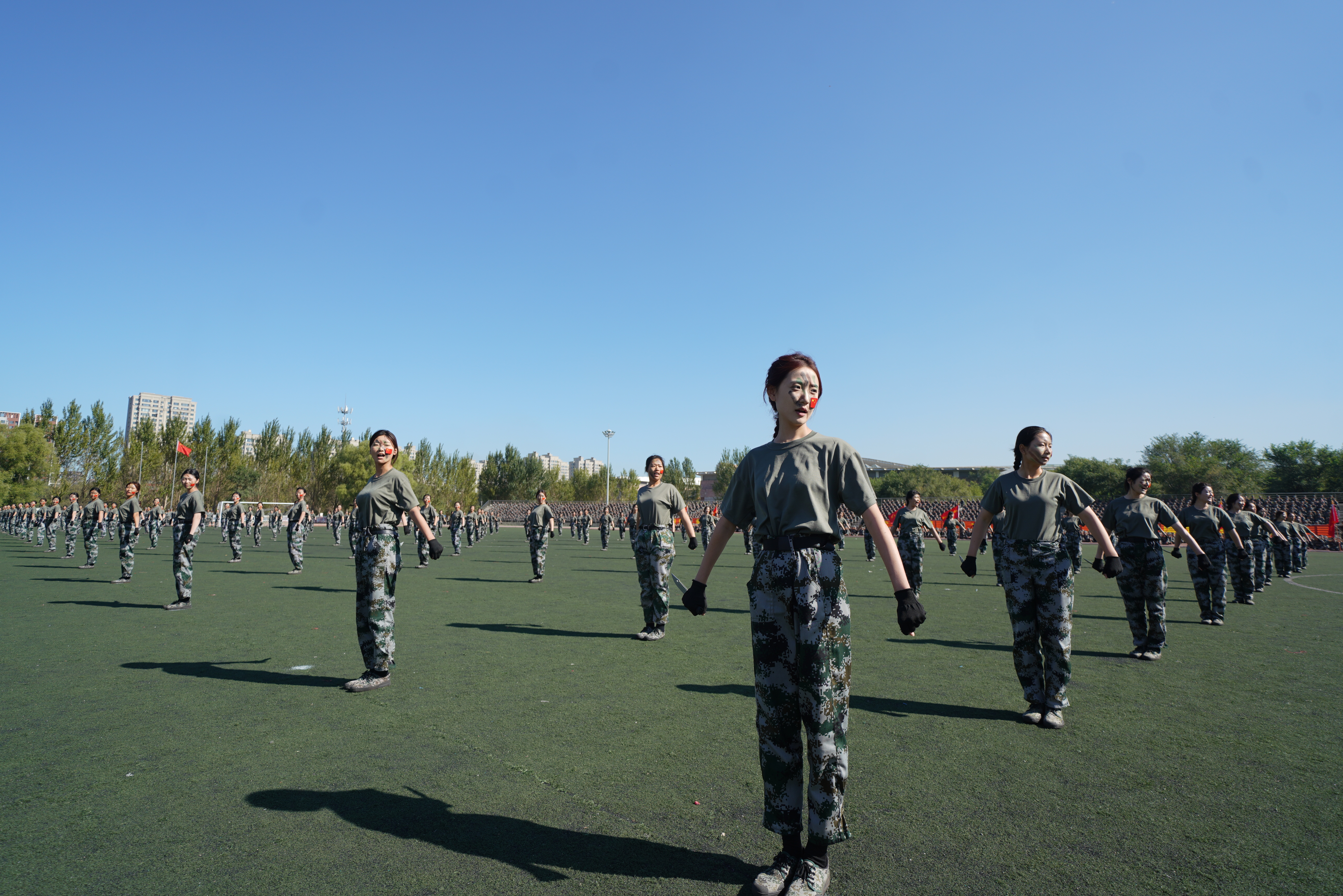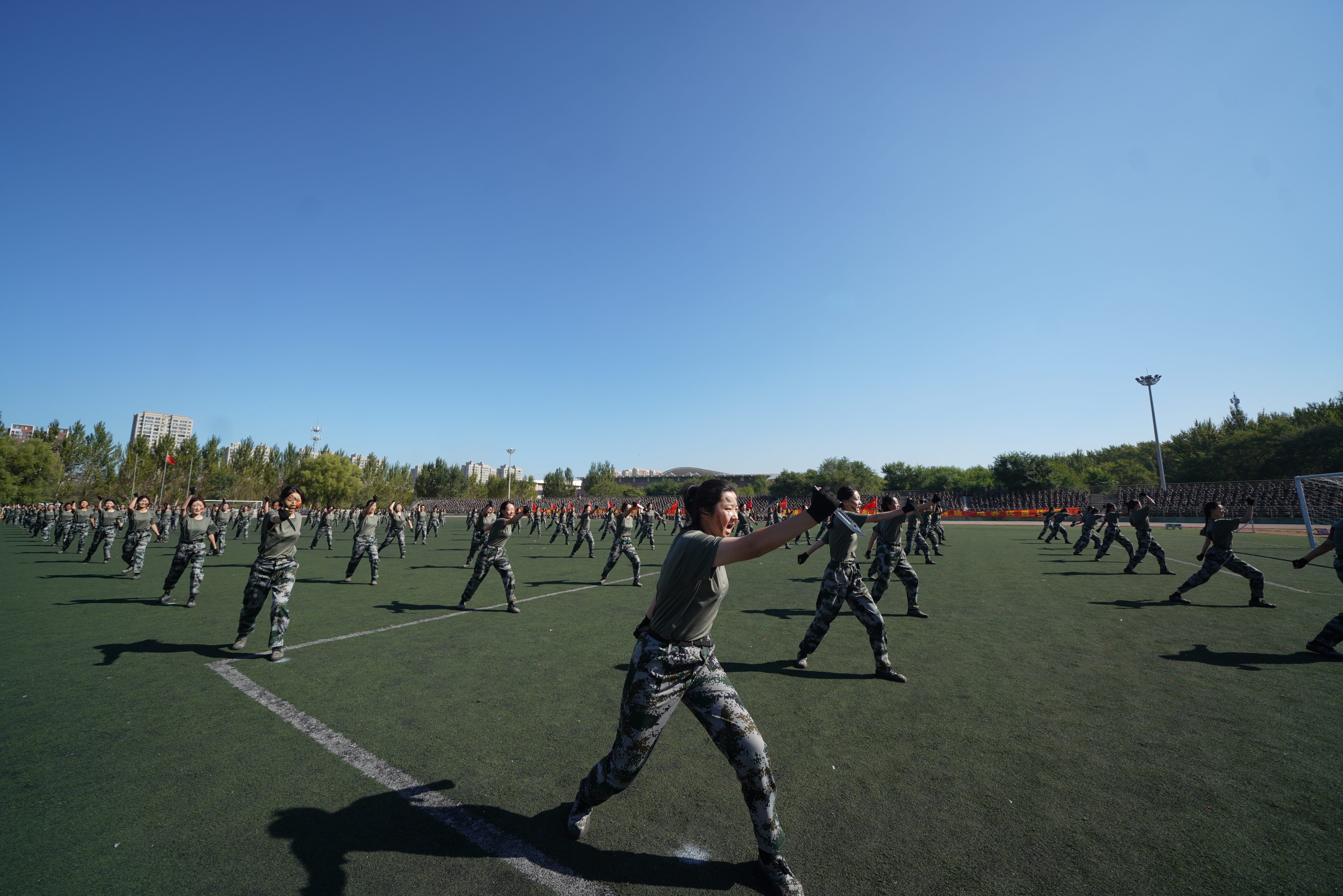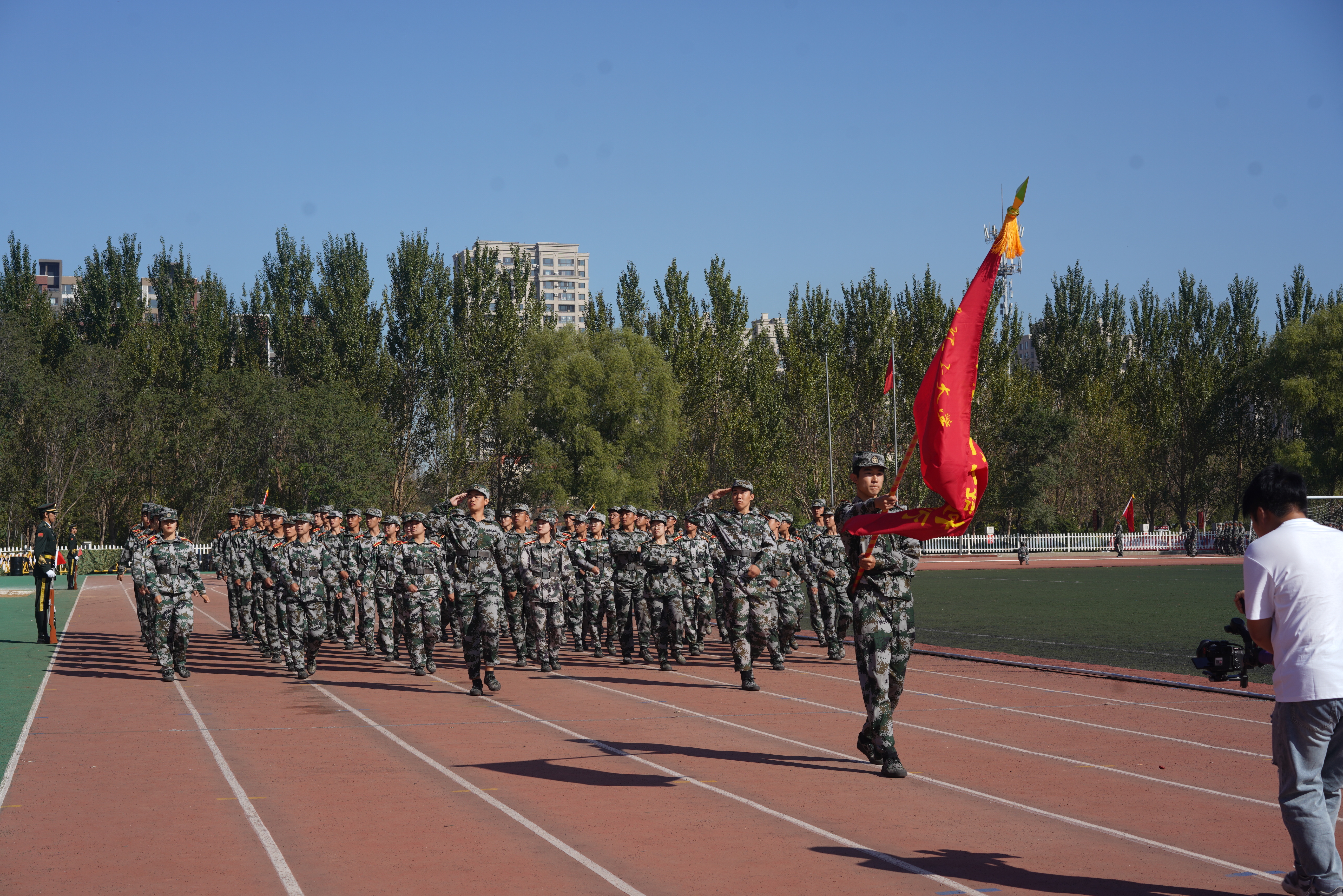 “迎军旗”,随着指挥员一声令下,国旗护卫队肩扛军旗走过方阵,十二个受阅连队伴随着雄壮的分列式进行曲,迈着矫健的步伐庄严地通过主席台,接受检阅。经过为期三周的军训磨砺,在受阅过程中参训学员目光坚定、军姿挺拔、斗志昂扬。一时间,龙翔体育场内步履铿锵、呼号阵阵,展现了兵工学子良好的精神风貌。随后,参训学员又汇报了“捕俘刀”和“战术对抗”科目的训练成果。