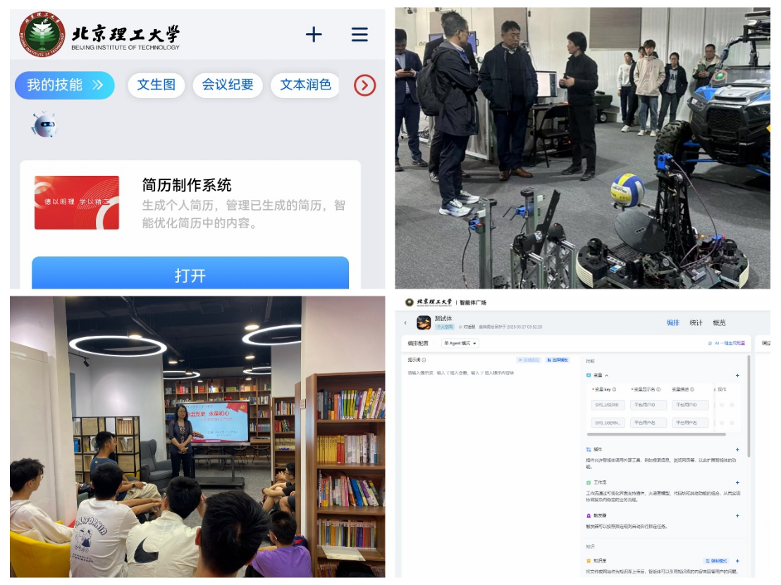 二是围绕师生参与,营造学生社区全员拥抱AI氛围。学校坚持将人工智能、计算机、大数据等专业学科与科研优势与智慧社区建设相融汇,发挥学生社区师生参与同频共振、学创集成同向同行的主体作用。一方面,在学生社区导学活动中,通过学育导师、朋辈导师强化引导科创赋能,引领学生认识人工智能的快速发展为各行各业带来的新机遇,促进多学科交叉融合,推进人工智能创新融入学生学习生活。例如,特立书院李泽湘双创班本科学生在学生社区自主研制、从0到1实现完全自主开发的智能排球机器人平台,通过仿真技术模拟复杂运动过程,利用人工智能训练出优秀策略并导入到机器人之中,未来可应用于学校体育课、排球爱好者陪练以及专业运动员技战术提升。另一方面,在学生社区举办“智能体大赛”,推出“智能体广场”,为校内师生提供不同层级的个性化AI应用自主搭建服务,引导师生结合“一站式”学生社区智慧建设的感悟和思考,主动发现问题、解决问题,以师生人工智能科创实践赋能智慧社区建设。
