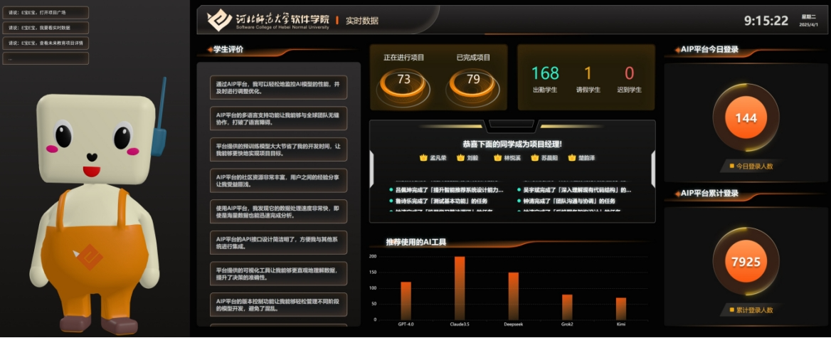 校园管理涉及大量重复性咨询与事务流程。平台以学院吉祥物“e宝”为形象载体,构建了拟人化智能交互系统。师生利用自然语言通过与AI问答精准获取所需信息,大大减轻管理服务压力。智能导览与问答,依托智能交互系统,平台可以针对校园场景精准推送实时信息,通过个性化测评,智能推荐适配资源,方便学生更针对性随问随答,提高回答准确性和匹配度。构建自然语言交互智能助手,师生可通过自然语言查询校规校纪、申请流程等信息,覆盖校园导览、生活服务、学业规划等200+场景,实现高频问题3秒响应。智慧语音服务,针对班会效率低、记录繁琐等问题,平台推出智慧班会系统。会议中,AI实时转写讨论内容,自动提炼关键任务并分配至责任人,会后生成图文并茂的纪要报告,同步归档至班级云端空间。这一功能有效减轻辅导员工作内容,使其能将更多精力投入学生个性化指导。管理驾驶舱则通过可视化看板整合学生学业、实习、就业等全维度数据。管理人员可动态追踪学生发展轨迹,及时识别学业预警或就业困难群体,为精准帮扶提供依据。例如,系统发现某学生实习投递成功率偏低,自动推送简历优化课程与对口岗位信息,助力其提升竞争力。