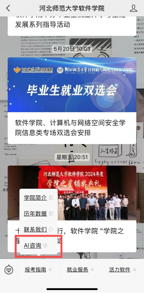 2023年起,学院依人工智能教育技术资源,持续探索AI技术与学生管理的切入点,自主研发智慧管理平台,从平台构思搭建到编码应用、商业模式构建等环节全部由学生自主完成,在教师的指导下,学生自行组织、自我管理,深入体验人工智能技术应用下的项目管控全过程,以“数据集成、功能多元、服务精准”为原则,打造了智能化学生社区服务平台,同时链接学院官方微信公众号,实现服务“一键直达”。
