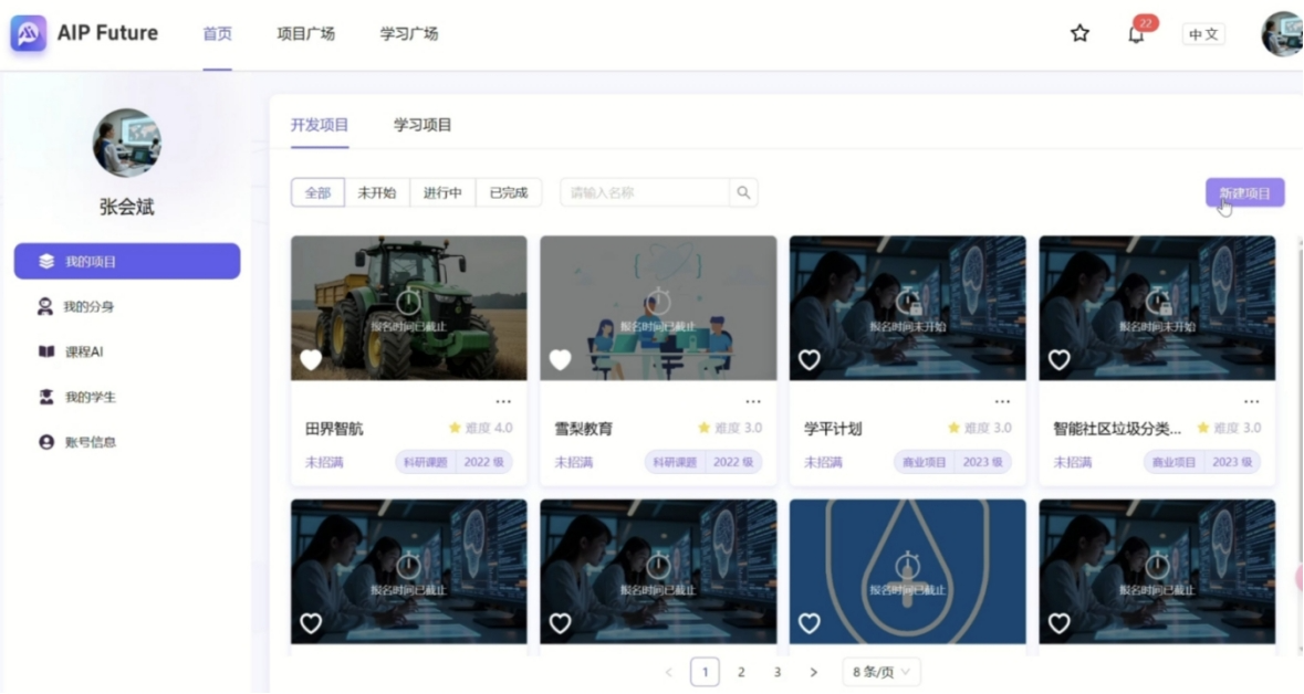 第二课堂是培养学生综合素质的重要阵地,平台为社会实践与科研创新项目提供全流程支持。项目智能组队:平台基于每位同学的技能标签与兴趣偏好,智能推荐主题项目(如“乡村教育帮扶”“非遗文化传承”),并生成包含任务分工、时间节点的实施方案,学生可根据自己的喜好和能力选择项目参与其中担任相关开发角色,学院高年级学生参与率100%,84.91%的学生反馈项目实践能力显著提高,66.51%的学生反馈团队协作能力进步明显。项目执行中,系统将实时监测每个人所负责的工作进度,提醒关键节点,确保实践成效。