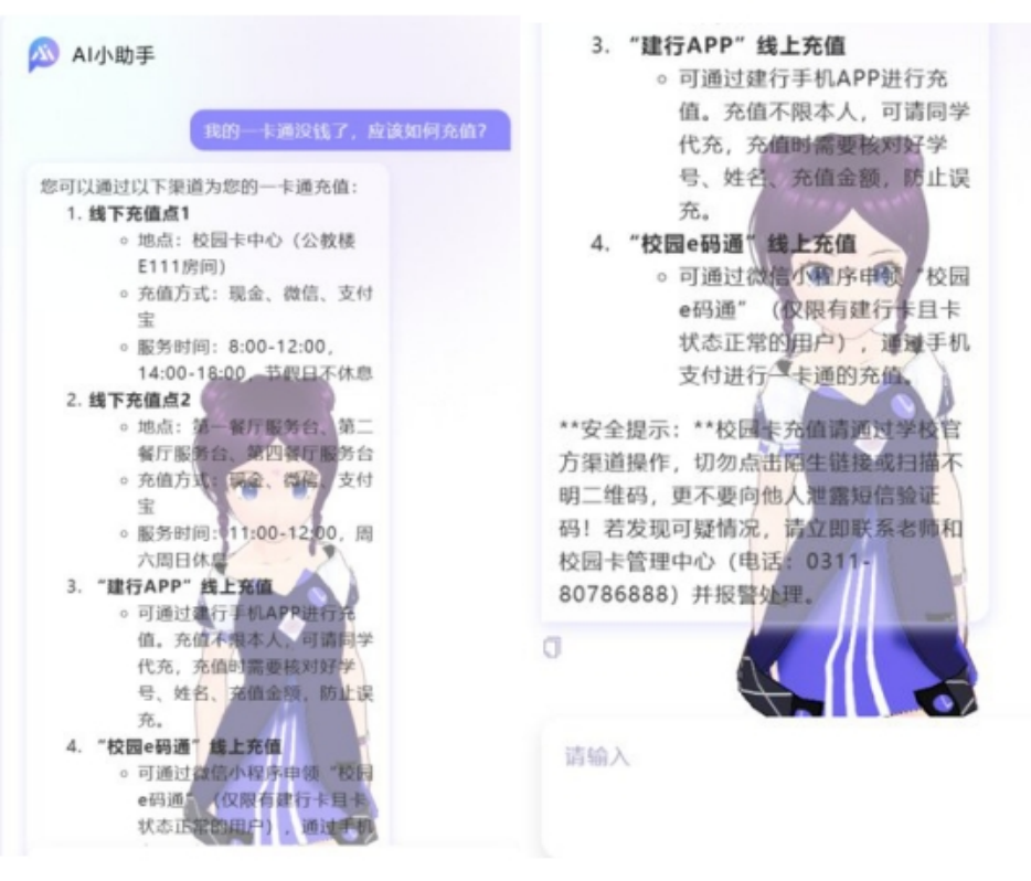 新生初入校园,常面临环境陌生、信息碎片化等挑战。为此,平台设计了以自然语言交互为核心的智能助手,新生只需通过语音或文字提问,即可实时获取精准指引,为学生提供个性化信息推荐。例如,输入“如何激活一卡通”、“宿舍楼位置”、“一类、二类竞赛”等问题,系统不仅反馈操作步骤,还能结合地图导航细化到具体楼栋和办理时段。