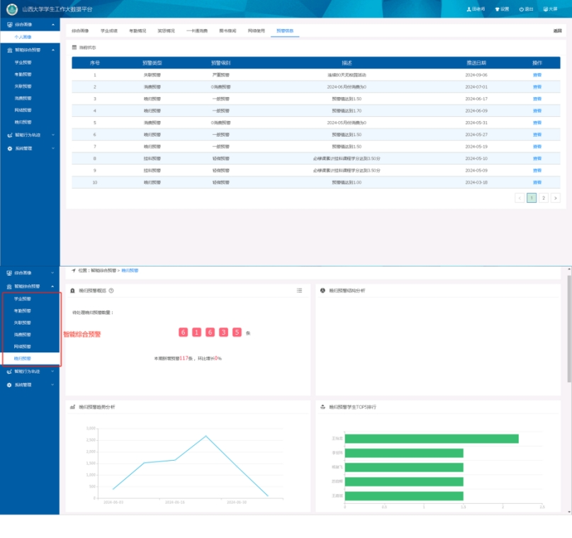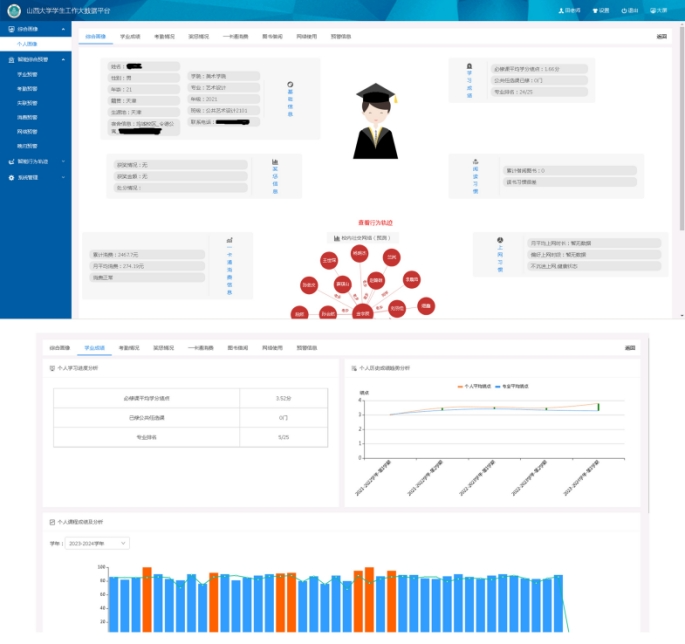 完善“山西大学学生大数据分析平台”建设,建成“学生综合行为画像”“学生智能综合预警”两大板块,学生综合行为画像全方位挖掘学生数据,清楚掌握学生行为轨迹、学习状况、社交关系、消费情况等,生成学生个人综合行为画像。“学生智能综合预警”提供学生学业预警、失联预警、消费预警、逃课预警、网络预警、晚归预警等,实时掌握学生动态,第一时间纠正学生在学习、生活等方面问题,实现学生成长全过程引领。在社区构建并启动“智慧教学数字化平台”,平台设置多个功能模块,发布教师授课内容,帮助学生回看教师授课,为每个学生提供数字化资源,突出智慧化育人导向。