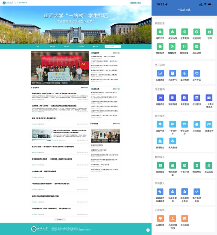 打通学工、教务、后勤等多个部门数据系统,开通山西大学“一站式”学生社区智慧服务云平台,包含课程育人、科研育人、实践育人、文化育人、服务育人、资助育人、心理育人等10大育人模块,34个栏目,汇聚了优质的共享资源,提供了高效的业务服务,横向覆盖管理、服务、育人场景,纵向贯穿入学至毕业全周期,做到了智慧育人全覆盖,服务学生“零距离”。
