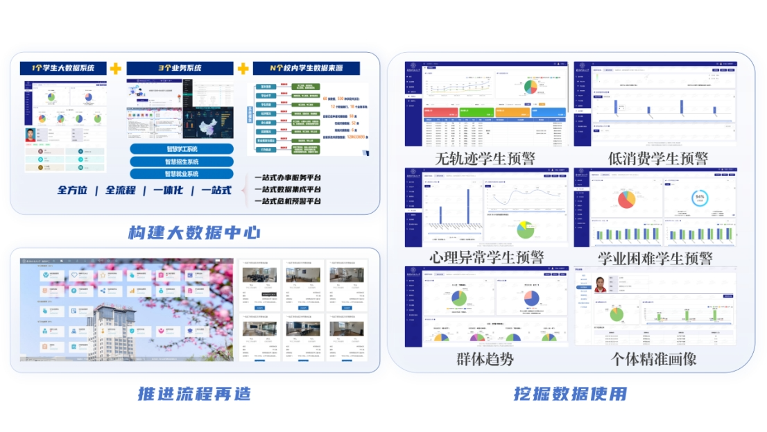 学校持续完善优化校园行为数据治理和使用,为社区学生健康成长保驾护航。一是构建大数据中心,让数据从分散孤岛到集成贯通。统筹校内涉及学生在社区的所有动态数据近2亿条,构建覆盖学业成绩、消费习惯、心理动态、就业偏好等20余类数据的“学生大数据中心”,形成“群体趋势精准分析、个体画像动态生成”的双维模型,为社区智慧育人提供坚实数据底座。二是推进流程再造,让学生在社区从线下跑腿到线上秒办。将入学登记、请假离校、心理测评等54项高频事务线上化,年均办理业务12万次,实现了无接触式的一网通办,极大提升了学生社区管理和服务的科学化、信息化水平。三是挖掘数据使用,实现从经验判断到数据预警。实时采集进出校、消费、借阅图书、进出宿舍、课堂出勤等数据,通过毫秒级数据联动网络,实时采集学生进出时间、行为轨迹等8类动态数据,构建异常行为预测模型,对夜间高频晚归、连续缺勤等场景自动触发三级预警,实现从“被动响应”到“主动预判”,累计处理有效预警记录800余条,2024年累计处理突发安全事件32起,均实现10分钟内快速处置。
