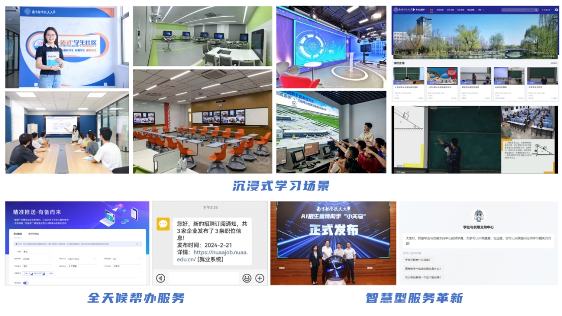 学校积极探索技术赋能社区应用场景,为社区智理贡献南航实践方案。一是重塑社区空间,赋能社区沉浸式学习场景。升级200间智慧学习空间,支持授课、研讨、分组协作等多模式教学;建成XR沉浸式数字中心,开发虚拟仿真项目,学生可借助VR/MR设备“身临其境”体验社区;整合“飞天云课堂”“雨课堂”等平台,实现多校区同步授课、课程实时回放,有效提升学生在社区的自主学习效率。二是开发AI大模型,赋能社区全天候帮办服务。开发“小天马”“微爷”“九叶”等AI服务大模型,通过人机互动,24小时不间断帮助学生在社区开展业务办理、解答学生学习生活困惑。日均服务400人次,有效降低社区辅导员事务性工作量,提升学生在社区生活的幸福感。三是实现精准追踪,赋能社区智慧型服务革新。依托大数据分析学生校园卡消费频次、金额及商品类别,构建“隐性贫困指数”,对于月均消费<800元且高频购买低价套餐的学生,触发“暖心资助”流程,定向发放餐补,提供勤工助学岗位和发展型资助项目,构建“学业-经济-心理”多维帮扶模型,累计发放精准补助超500万元,实现困难学生精准帮扶。在就业服务场景中,依托知识图谱技术构建“学生能力—岗位需求”语义关联网络,“智慧就业”系统对地域偏好、行业倾向等显性标签与实践经历等隐性技能进行动态解析,通过学习算法实现跨平台数据协同建模,日均生成个性化岗位推荐清单3000余份,2025届毕业生签约率同比上升。