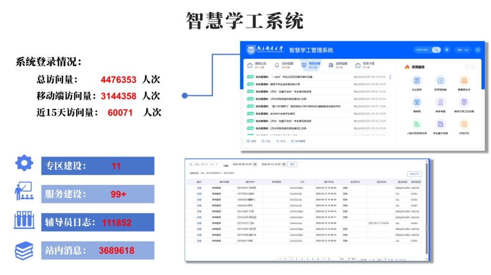 建成“智慧学工”等智慧平台,为学生从入学到离校提供全周期“一站式”服务