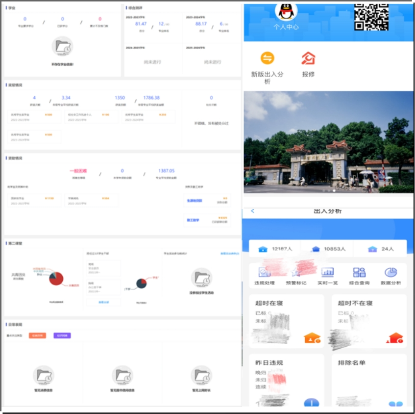 建立校级学工事务数据中台,整合学生基本信息、请销假办理、教室审批、迎新离校、资助管理等8大类、17小项的信息功能数据,信息更为便捷贯通,提升工作效率。形成覆盖全面的学生生涯周期成长档案,为精准育人提供数据支撑。同时,打通与后勤、保卫等部门的数据接口,实现校园卡消费、门禁出入、健康监测等数据的实时共享,出入管理、安全防控、心理预警等场景的精准决策,构建“数据共享、业务协同、流程贯通”的治理新生态。