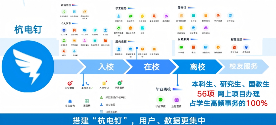 学工部牵头构建了“杭电钉”生态,集成“一键组班”、“智能场地预约” 等功能于一体,建成“人人可参与、时时可感知、处处可联接”的一站式服务平台,实现56项学生高频事务100%一网办理,从“最多跑一次”到“一次不用跑”的新型管理模式,极大地提高了思政教育的覆盖面和实效性,相关经验入选教育部易班发展中心典型案例。