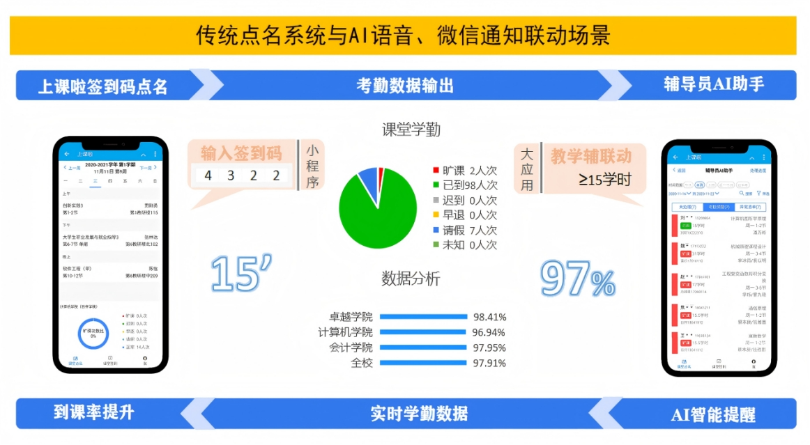 基于思想品德、学业发展等5大维度数据,自动生成学生成长画像,精准识别学业困难等重点关注群体。通过建立“学业预警—全员帮扶—精准评估”的全链条闭环机制,及时对有学业困难、心理压力的学生开展针对性帮扶和引导工作,实现了对学生的精准关怀和教育。例如,“上课啦”学勤管理系统结合AI智能提醒,实时推送旷课预警给辅导员,学校平均到课率提升10%,退学警示学生数下降10%。