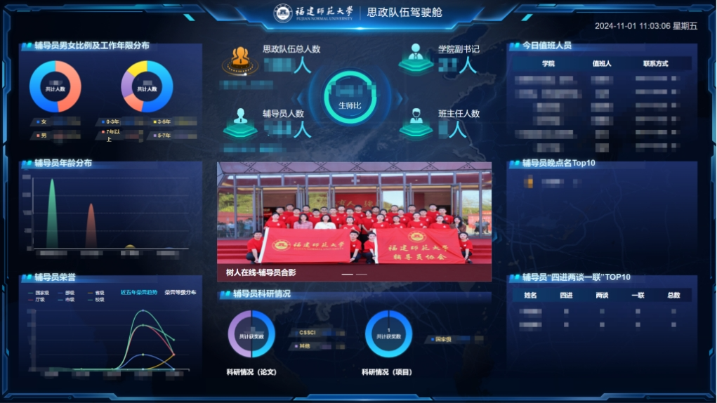 学校大力构建“数据驱动、多端协同、智能预警”的治理生态,激发数字化活力,扩大内容供给,打通数据孤岛、贯通业务链条、融通育人场景,实现精准治理既有“数智硬度”,更显“人文温度”。一是数字筑基,锻造专家型育人团队。搭建学工队伍全周期管理体系,通过工作日志云存档、值班安排智能排班、科研成果线上共享等功能,构建辅导员成长“数字档案库”,推动队伍管理科学化、专业发展可视化;持续建设“思政队伍驾驶舱”可视化思政数据分析平台,全力推动精准思政工作从数字化向智慧化转型升级。