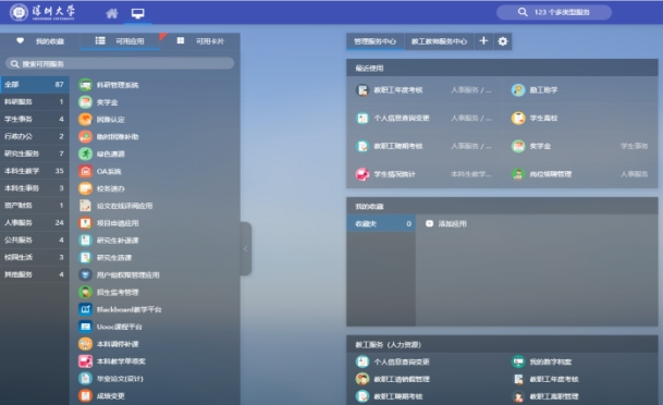 建设深圳大学网上办事大厅,为学生提供“一网通办”的企业微信线上服务。学生通过PC端、手机端可实现教务选课、宿舍申办、学籍异动、违规违纪、档案流转等123大类,1000余项业务的网上办理,年均使用超10万人次。