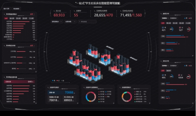 为精准掌握学生住宿情况,细化管理颗粒度,提升社区办事效能,提高社区住宿幸福感,“智慧学工平台”整合校内住宿数据及应用,实现住调退宿一键申办、社区违规违纪处罚、宿舍通行数据集成、宿舍电控实时管理。通过住宿申办功能,学生足不出户一键办理住、调、退宿业务;通过领导驾驶舱功能,实时展示社区各类数据,辅助管理人员快速了解社区运行状态,及时发现、解决问题。