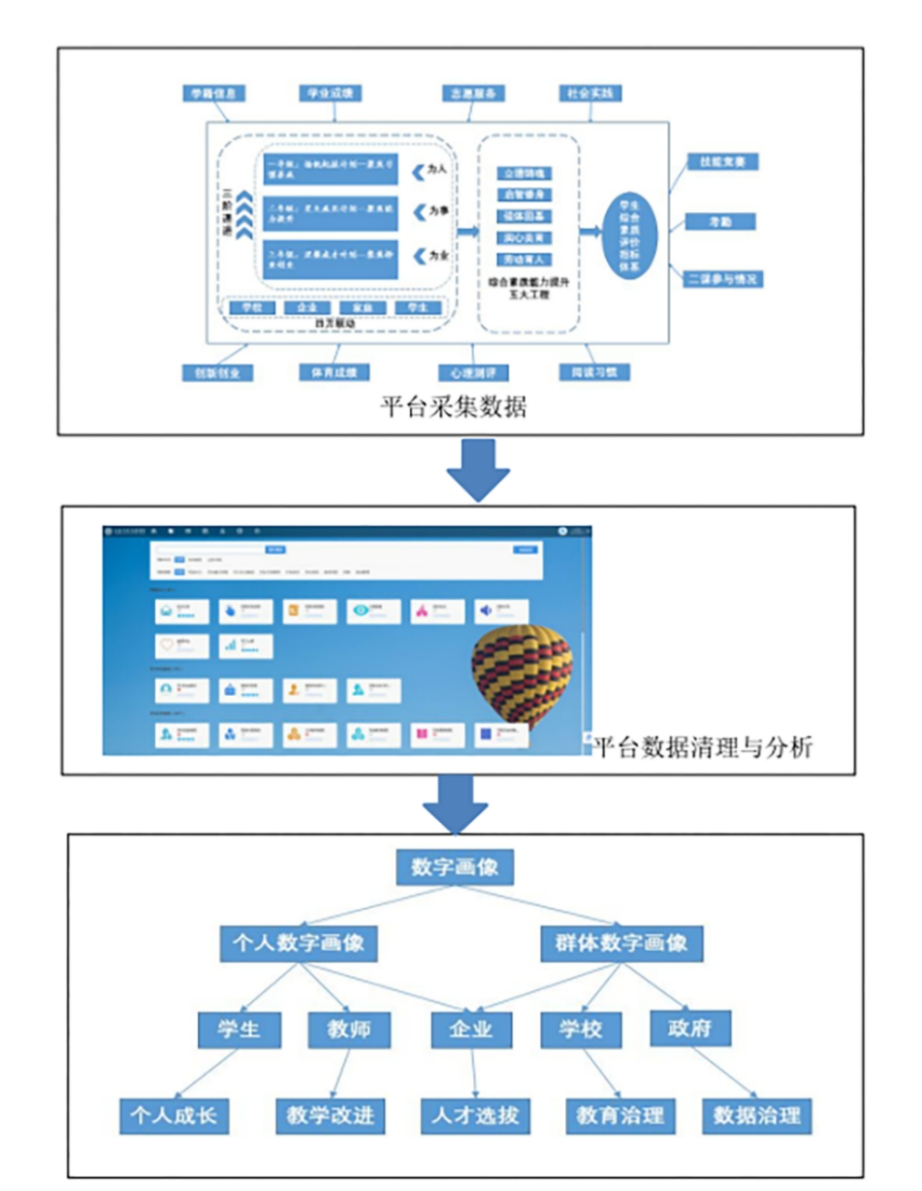三是打造“全息画像”数据中台。依托数字化、智能网联、大数据等专业教学资源和技术储备,积极与市内外高职院校和相关机构开展深度合作,探索以数字化技术为基础的全周期学生评价体系构建,系统集纳“外显和内隐”数据,如量化指标、获奖、项目等外显数据以及学生能力画像、对知识技能掌握度、教学满意度等内隐数据,以此为基础信息依据,最大程度描述教育真实过程,呈现教育本真的面貌,推动“一站式”学生社区精准育人价值回归。