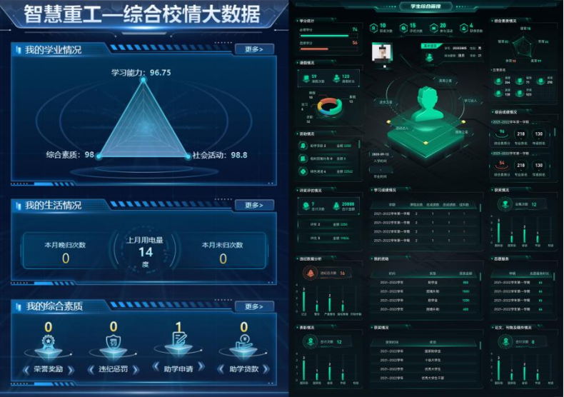 二是建立数据标准体系。依托“智慧重工”教育新基建建设,系统推进破除跨部门数据壁垒,重点解决管理系统异构化、终端设备碎片化问题。制定学生事务数据标准体系,建立统一数据接口规范、传输流程标准和共享授权机制,推动学生数据资源从行政管理资产向育人战略资源的根本性转变。数字化技术赋能学生学习、活动、实践、主题班会、第二课堂等20余个环节领域,实现学生事务数据全链路贯通。