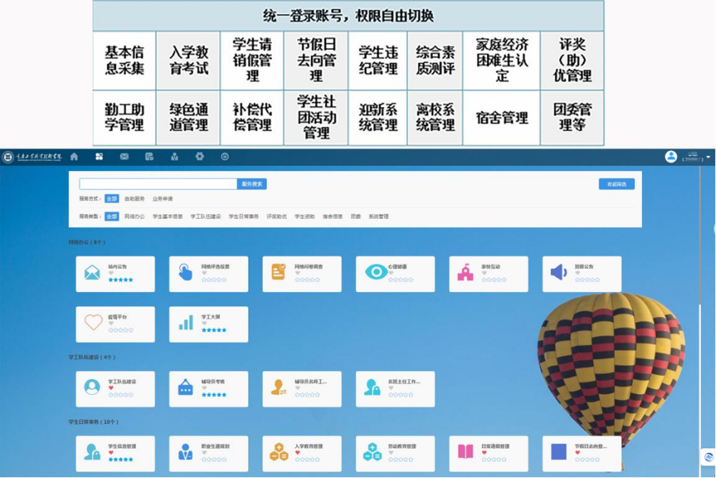 2023年12月重庆工业职业技术学院级后的学生关爱平台核心功能(共16个模块)及PC端