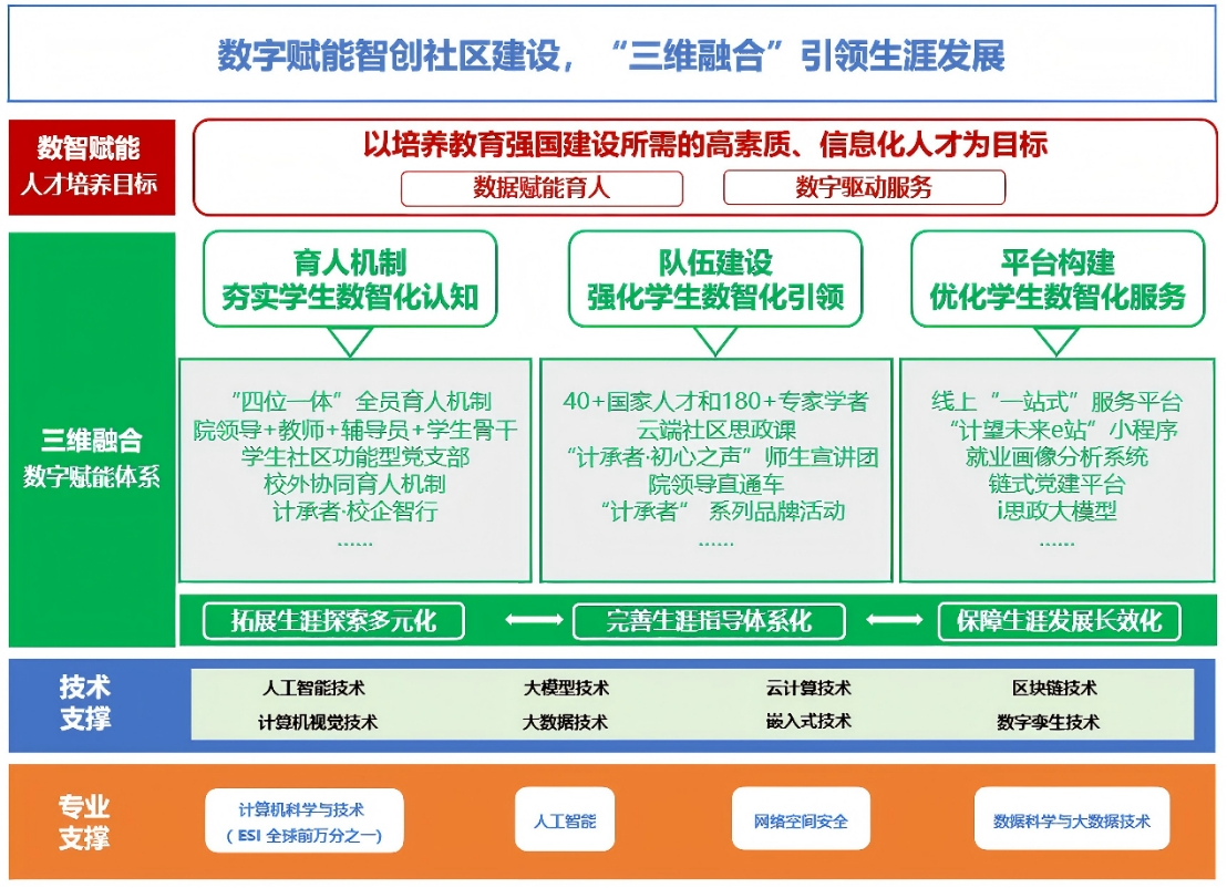 党的二十大报告强调教育、科技、人才“三位一体”协同发展,党的二十届三中全会明确提出推进教育数字化,为新时代高校人才培养指明方向。电子科技大学计算机科学与工程学院(网络空间安全学院)以培养契合国家战略需求的高素质信息化人才为目标,以“计望未来”“一站式”学生社区为载体,以“数字赋能学生成长成才”为主线,充分发挥学科技术优势,形成“三维融合”数字赋能体系:一维是育人机制夯实学生数智化认知,二维是队伍建设强化学生数智化引领,三维是平台构建优化学生数智化服务;精准护航学生生涯发展。
