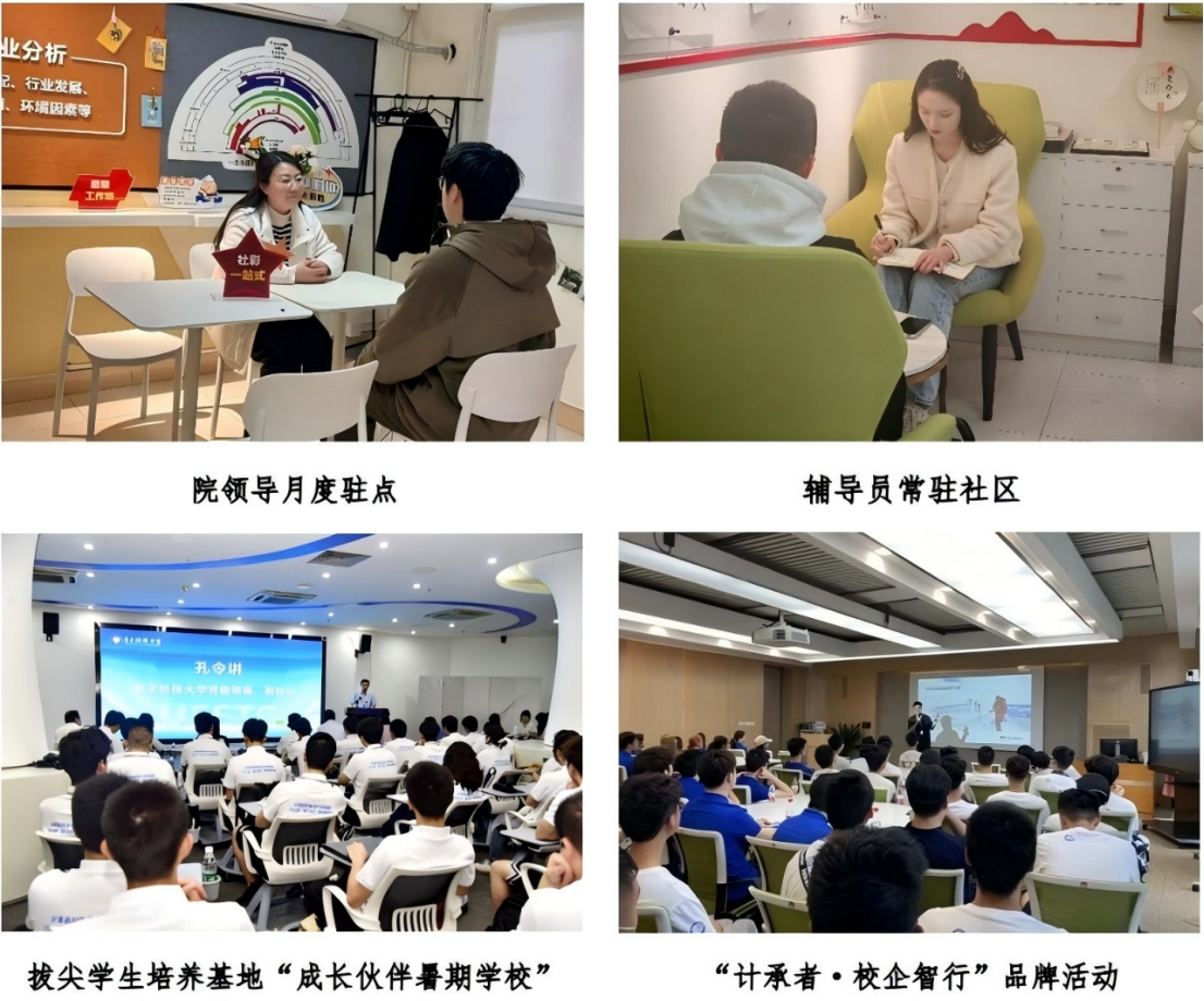 定期举行“院领导直通车”,面对面解决学生发展难题。组建“计承者·朋辈说”导师团,通过“1+N”帮扶促进共同进步。常态化开展“辅导员说”,实现思想、学业、心理全方位护航。人工智能赋能心理育人,咨询师入驻“计语驿站”,通过AR心理舒缓游戏提供沉浸式疏导。以数智技术贯穿育人全过程,培育学生数智素养。