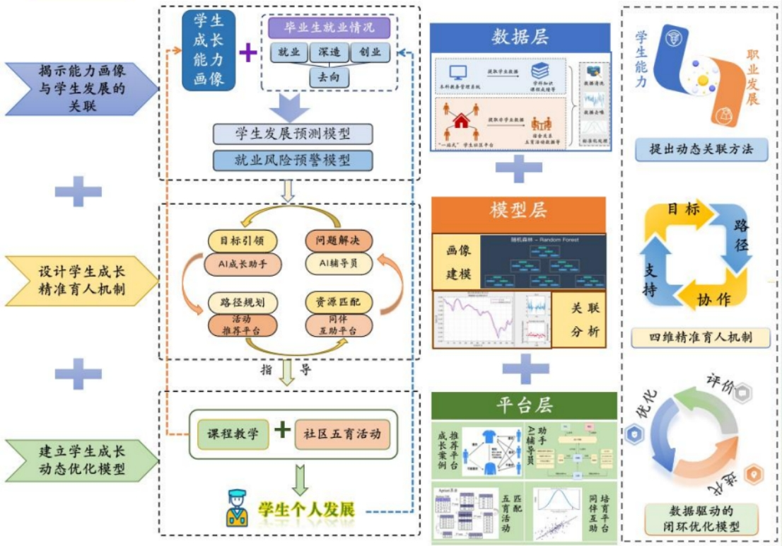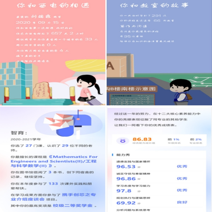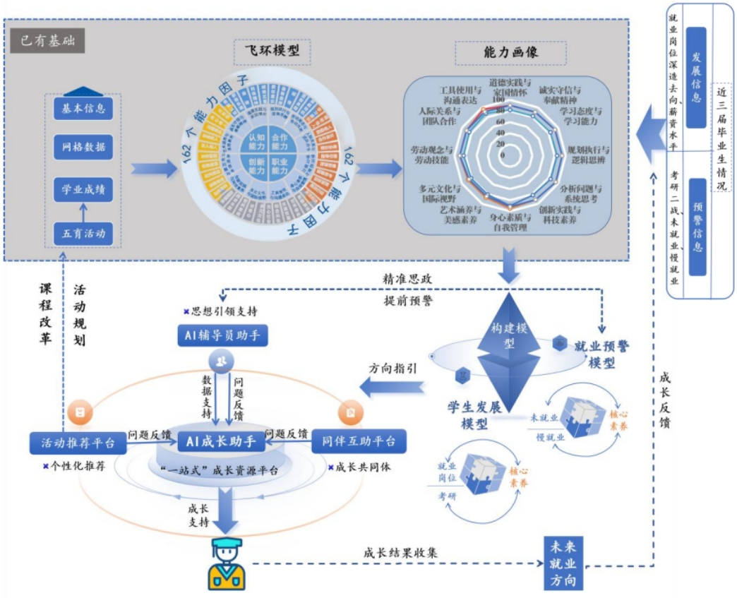 完善数据贯通和智能分析,实现从基础数据采集到精准分析的有力支撑。紧密依托“学在西电”“劳动教育”等信息平台,累计记录学生活动参与、荣誉表彰等伴随性数据2亿余条,实现学生数据的实时采集、动态更新,构建了覆盖学生全成长周期的数字档案。构建成长型发展评价体系,打造“四大关键能力+十二大核心素养”飞环模型。从培养大学生“认知能力、合作能力、创新能力、职业能力”等四项关键能力出发,拓展凝练大学生自我发展必备的“十二大核心素养”,形成“自我测试+行为爬取/核心素养+关键能力”的学生发展评价“飞环模型”,通过熵值法赋权构建生成个人能力雷达图和数字画像,配套产出学生发展报告。探索建设“AI成长助手”,依据学生特质与需求提供个性化发展支持。在对学生成长发展科学评价的基础上,识别学生短板不足,结合“最近发展区”理论,依托“AI成长助手”为学生智能推送个性化的学习资源和发展建议。统计显示,学生对于“AI成长助手”数智化平台推荐案例匹配接受度达到92%,学业规划采纳率达到96%。