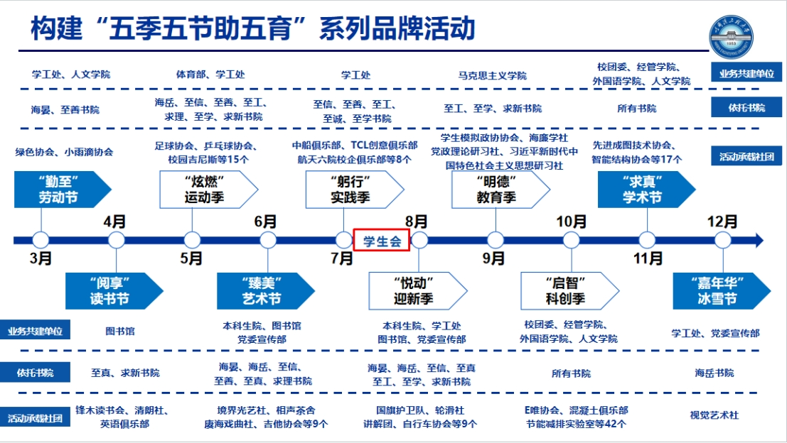 坚持“以文化人、以文育人”,通过体系化活动设计打通五育融合路径。一是党建引领扎根,筑牢信仰根基。筑牢“社区党建+”意识,通过励志大讲堂、党团日活动、楼宇文化建设等有效途径,打造特色“社区党建课堂”,设立党员示范岗、先锋寝,推进党支部共建联建与基层学术组织进社区,让理想信念教育进驻学生社区成为常态。学校党建工作成效显著,入选全国党建工作示范高校培育创建单位等党建荣誉百余项,战斗堡垒作用充分发挥。二是深化五育品牌,夯实素养培育。立足学生多元需求,创新构建“炫燃”运动季、“启智”科创季、“臻美”艺术节、“阅享”读书节、“嘉年华”冰雪节等主题鲜明、贯穿全年的品牌活动集群,年均举办活动300余场,实现德智体美劳素养培育全覆盖,形成“季季有主题、节节促成长”的浸润式育人节律,其中“嘉年华”冰雪节中的“雪地航母”活动历经6年持续升级,成为学校独具特色的国防教育名片,被新华社、央视、《人民日报》等国家级媒体广泛报道。三是深耕书香阅读,涵育思想铸魂。 建设“习经典·向未来”读书品牌,开展“红枫讲堂”“墨迹探美”等活动,将红色经典研读与思政教育深度耦合;发布年度阅读报告、评选借阅达人,推动阅读习惯养成与价值引领同频共振。