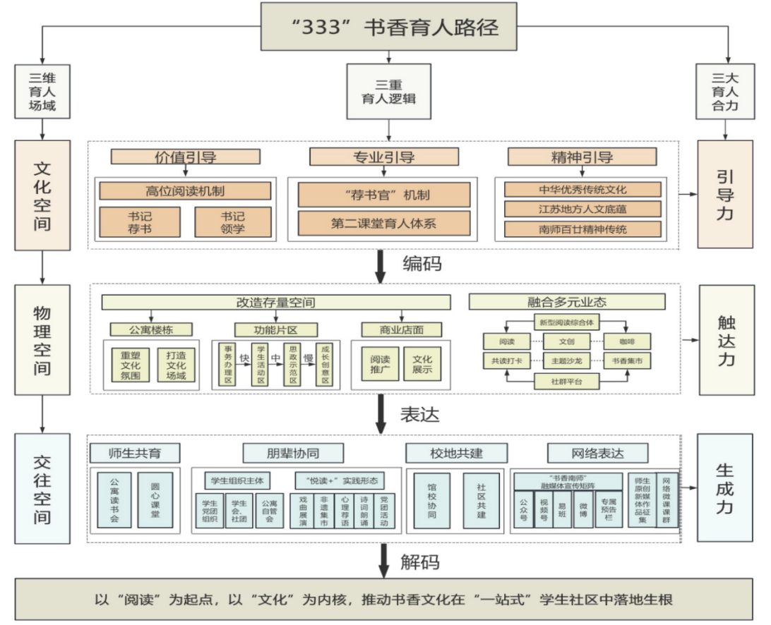 南京师范大学构建“文化空间—物理空间—交往空间”书香社区文化育人路径,贯通“编码—表达—解码”三重育人逻辑,发挥“文化空间引导力-物理空间触达力-交往空间生成力”三大育人合力,推动书香文化在“一站式”学生社区中系统生成、持续生长、落地见效。