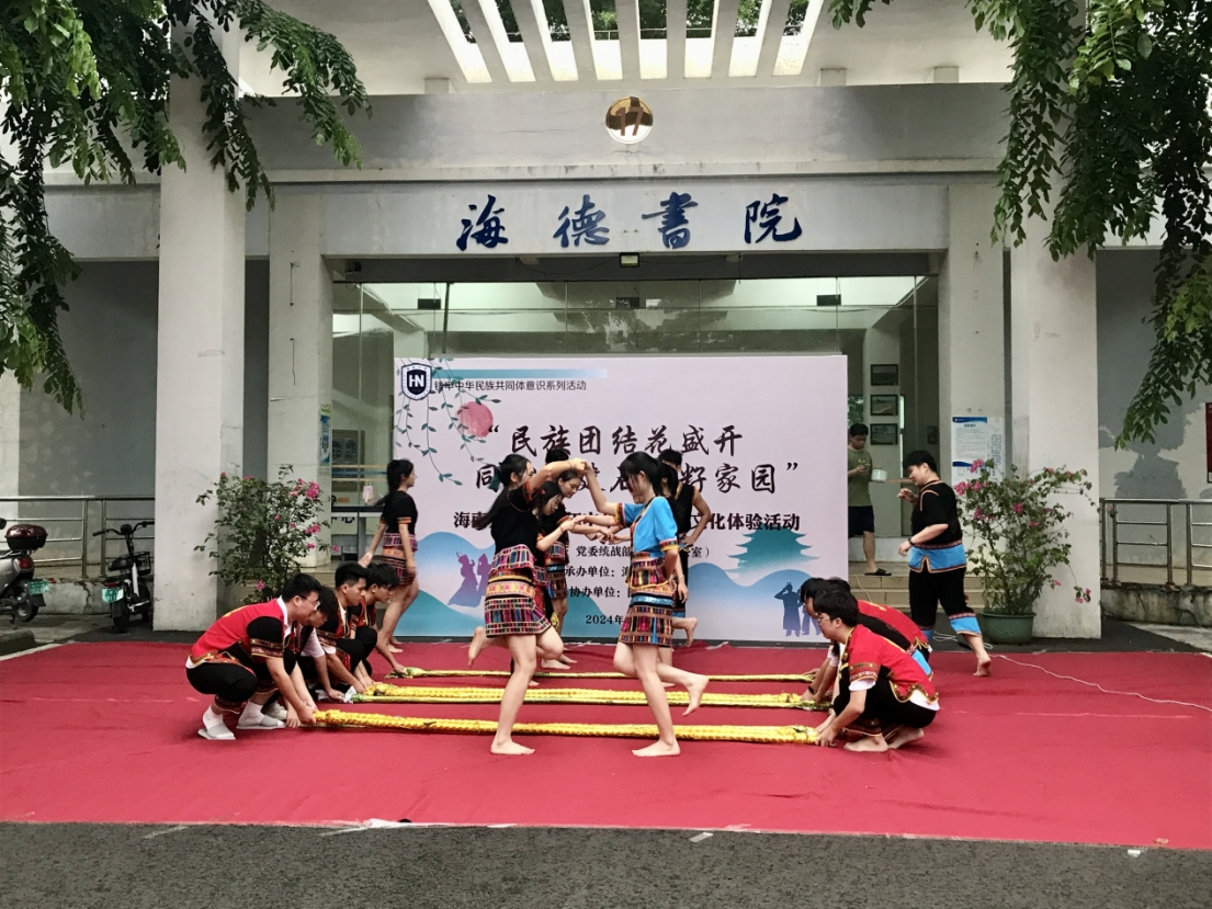 秉持传统文化传承与创新的初心,在海德书院、天工书院打造传统文化育人片区,引领学生守本源、正本心。一是东坡文化浓厚底蕴。成立海南省东坡文化研究中心,以“苏体”融入楼宇标识设计,举办学校东坡校园文化节,形成“谁家水调唱歌头”东坡诗词吟诵、“书香校园·悦览东坡”等品牌活动,参与学生1万余人。二是书香浸润修身立德。在社区公共空间打造图书角和阅览室,开展“热区丝路书香远 智汇经典永流传”系列活动,师生诵读海上丝路经典诗词,定期评选阅读之星、开展各类读书会,构建以书香为核心的“家门口文化生态”。孵化出“读《大学》与读大学”辅导员育人工程,覆盖学生2.3万人次。三是诗情画意以美培元。开设美育移动课堂,推动茶艺文化学习体验课、廉洁文化青年书画展等活动进社区。举办“风雅颂”社区文化节,沉浸式开展拓印、扎染、漆扇、簪花等非遗文化体验。将海南黎族竹竿舞、黎锦、琼剧等引入学生社区,创新“非遗传承人+通识教育”的教育模式,掀起传统文化传承热潮。