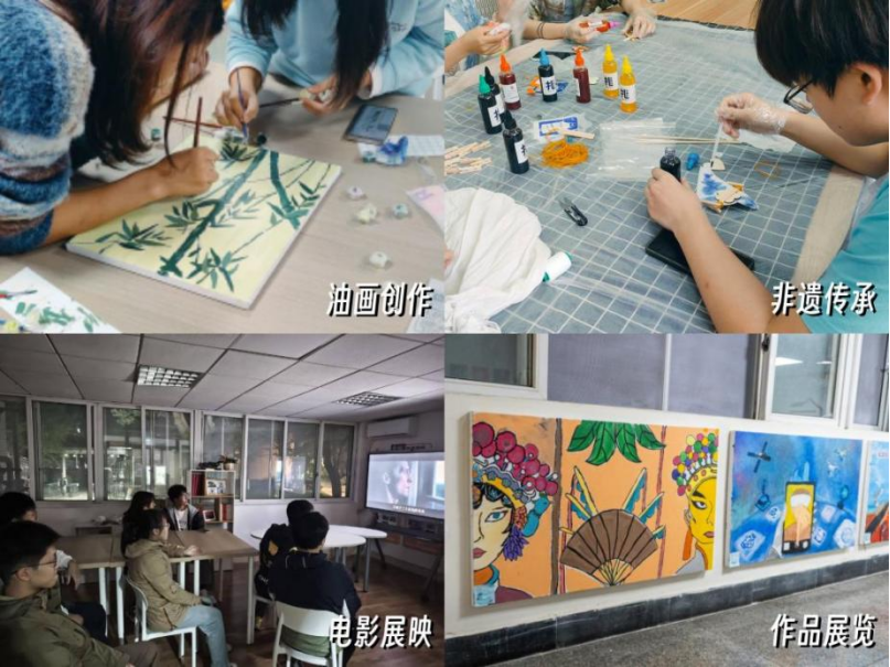 依托美育、劳育工作室,将传统文化浸润同劳育美育相结合,打造“非遗手工坊”、“香农放映厅”、“信雅艺韵展”等特色活动。开设扎染、剪纸、面塑等非遗体验课程,邀请非遗传承人现场教学,累计超30场,参与人数超1000人;展映经典影视作品超60场,参与人数超3000人;征集书法、手工艺、绘画等传统文化主题作品数百件,以此构建“学生创作-社区展示-文化反哺”模式,深化文化理解与创新表达。