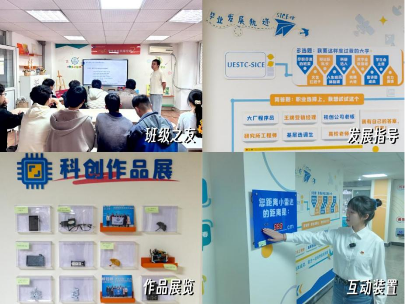 依托学生创新创业中心、科研团队、重点实验室,将学科文化传播与科技创新实践、生涯规划指导深度融合,打造“科创作品展”“创意互动角”“优秀院友进班级”“SICER毕业发展轨迹”等特色品牌活动。收集展出学生科创作品60余份,自主设计互动装置2个,培养学以致用的创新精神。聘请40余位企业高管、型号总师等担任领航导师,引导学生将个人理想融入党和国家事业发展。打造“通信技术变革”“雷达种类知多少”“创意投影灯”等文化展示区域,立体呈现学科知识的应用价值。