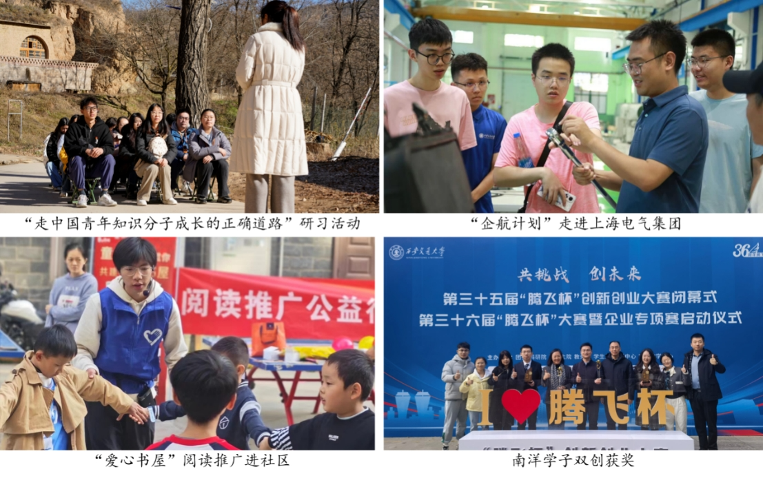 一是以主题实践锚定价值取向。通过“场景化学习”定期组织学生走进延安、照金、绵阳等红色教育基地,开展“走中国青年知识分子成长的正确道路”研习活动。二是以真枪实弹建立知识坐标。围绕学校“6352”工程和“1121”模式拓展教育实践载体,施行“企航计划”,组织学生走进中广核等50余家企业,与腾讯等30余家企业签署教育部供需对接育人项目、社会实践基地。三是以个体实践延伸群体共创。以“学科+实践”为基础,每年组建百支社会实践队伍,成立南洋青年志愿者协会,每周开展“爱心书屋”“土门社区支教”等长线志愿服务,受到中国青年网和三秦都市报等30余家各级媒体报道,3次选入全国大学生知行计划“榜样100”榜单,获评“挑战杯”全国金奖3项。