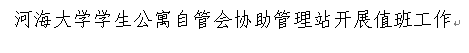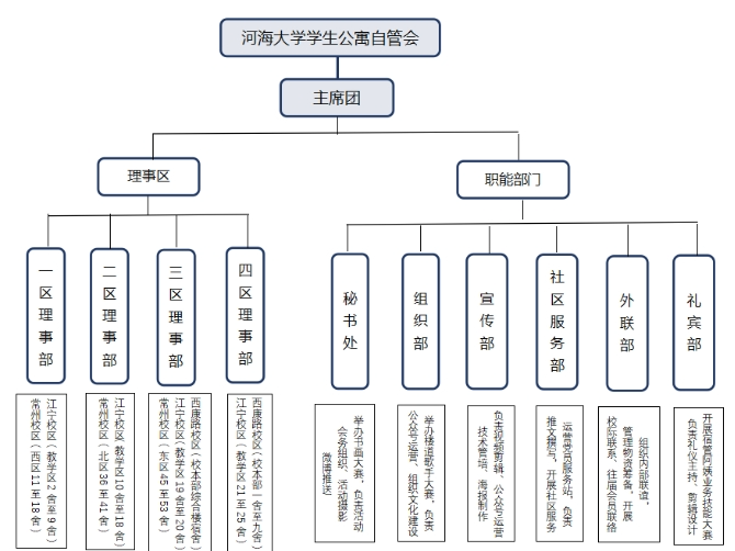 河海大学于2001年成立学生公寓自管会,由学生工作处和校团委协同指导。旨在通过群众性学生自治组织建设,引领学生参与学生社区管理,锻炼和提升学生自我教育、自我管理、自我服务能力;同时搭建学校、学生、物业沟通桥梁,改进社区服务水平,提升学生社区生活体验。