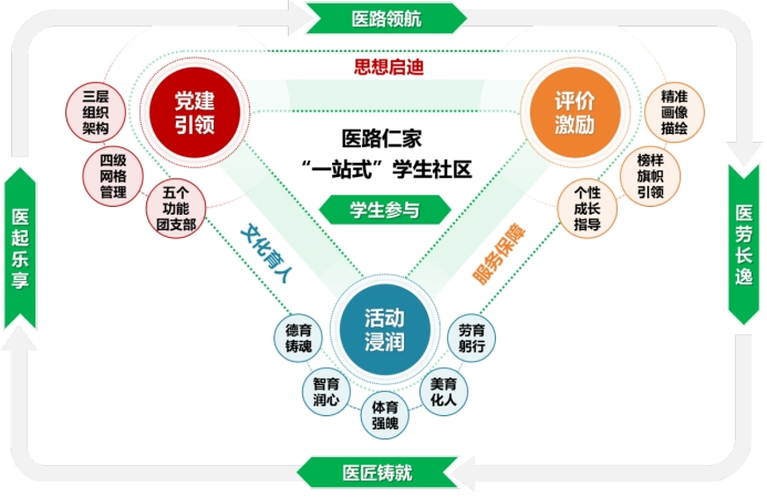 在“一站式”学生社区育人阵地中,青年学子作为跃动的“微细胞”,通过释放创新动能,持续激活社区育人新生态。医路仁家秉持“以学生为主体、以参与为导向、以成长为根本”的理念,紧扣学生参与主线,通过“党建引领红、活动浸润蓝、评价激励黄”三色育人模式,构建“责任共筑、协同尽责、成果共享”的社区治理共同体。