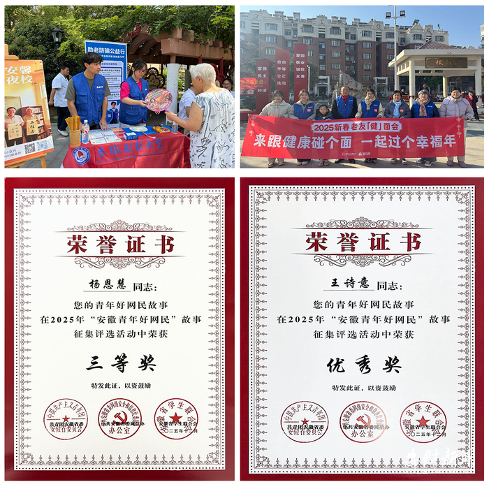 杨恩慧同学秉持“以新媒体为舟,载青春担当远航”信念,自2025年寒假起,协助运营蚌埠安馨社工组织新媒体平台,全程参与志愿服务纪录片的策划、拍摄与剪辑工作。她深入“蓝马甲助老行动”一线,记录服务筹备与开展过程,积极传递志愿服务正能量。此外,她定期走进社区,开展智能手机使用教学与反诈骗知识普及,助力老年人跨越数字鸿沟。期间,她采写的助老服务推文,生动还原了志愿者耐心帮扶老人融入数字生活的场景,收获网友广泛点赞和转发,并被安徽卫视“安徽之声”报道,有效提升了相关活动的社会影响力。王诗意同学主要负责蚌埠高新区智能养老项目,带领团队努力探索“互联网+养老”新模式,利用网络平台高效链接多方社会资源,积极开展反诈助老服务。在关注“一老一小”群体中,他尤其重视儿童关怀,牵头开展幼儿园支教活动,并利用互联网整合优质教育资源、宣传志愿服务故事,切实将网络影响力转化为公益实践力。