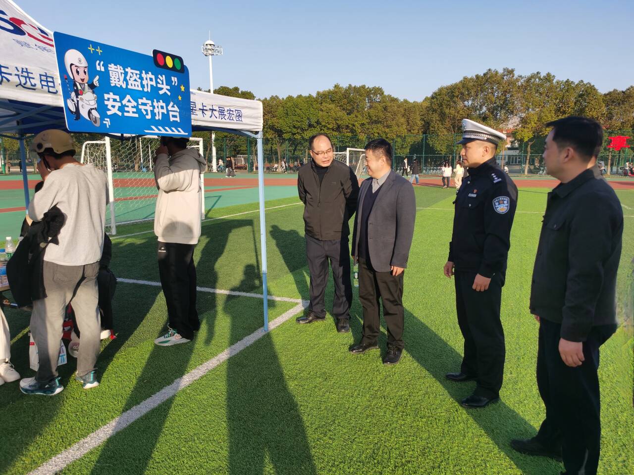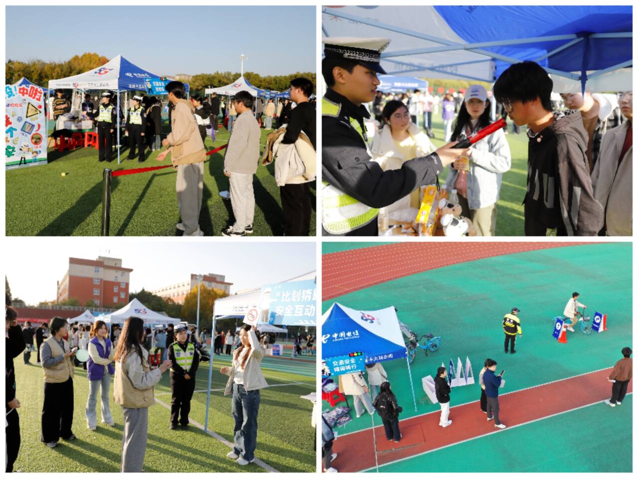 活动现场,精彩的交警铁骑表演瞬间点燃现场气氛,充分展现了交警队伍的专业素养,也让师生感受到交通安全保障的坚实力量。学校联合交警部门精心打造“酒精快检护平安”“学好标牌·文明出行”“头盔护顶·平安骑行”三大主题展台,通过酒精模拟检测体验、交通标志现场答题、头盔正确佩戴教学等沉浸式体验项目,帮助同学们直观掌握交通安全技能,切实提升自我保护能力,活动现场学习氛围浓厚,教育效果显著。