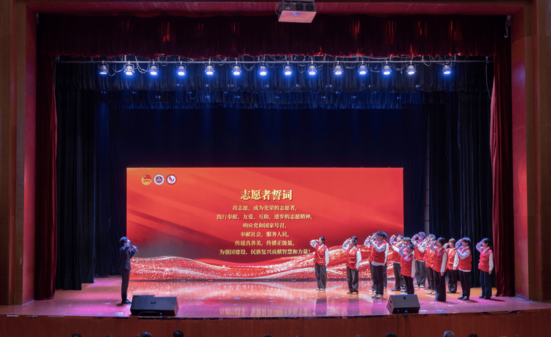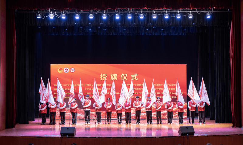 随后,现场举行2026年“团百花”学雷锋志愿服务团队授旗仪式。各学院志愿服务团队负责人接过旗帜,扛起志愿服务的责任与使命。青年志愿者代表进行集体宣誓,以铮铮誓言许下服务他人、奉献社会的青春承诺。