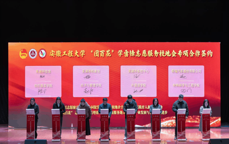 在签约环节,材料科学与工程学院、经济与管理学院等8个学院分别与奇瑞汽车股份有限公司、芜湖市档案馆等8家合作单位签署了志愿服务专项合作协议。校地企三方将以资源共享、项目共建、人才共育为核心,推动志愿服务项目落地见效。