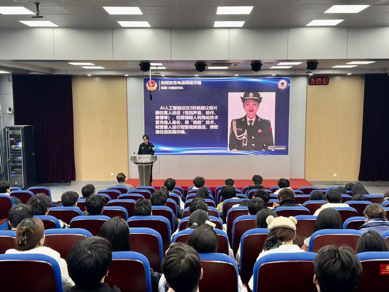 反诈干警结合近期社会典型诈骗案例,通过短视频、数据分析等方式,讲解了电信网络诈骗的主要作案手法,并以“AI换脸”技术为例,剖析了新型网络诈骗手段及应对策略。针对校园诈骗的特点,干警提出了具体的防范方法和措施,提醒师生树立正确的消费观与交友观,提升网络信息甄别和风险应对能力,守护好自己的“钱袋子”。活动现场还向学生发放了反电信网络诈骗宣传手册。