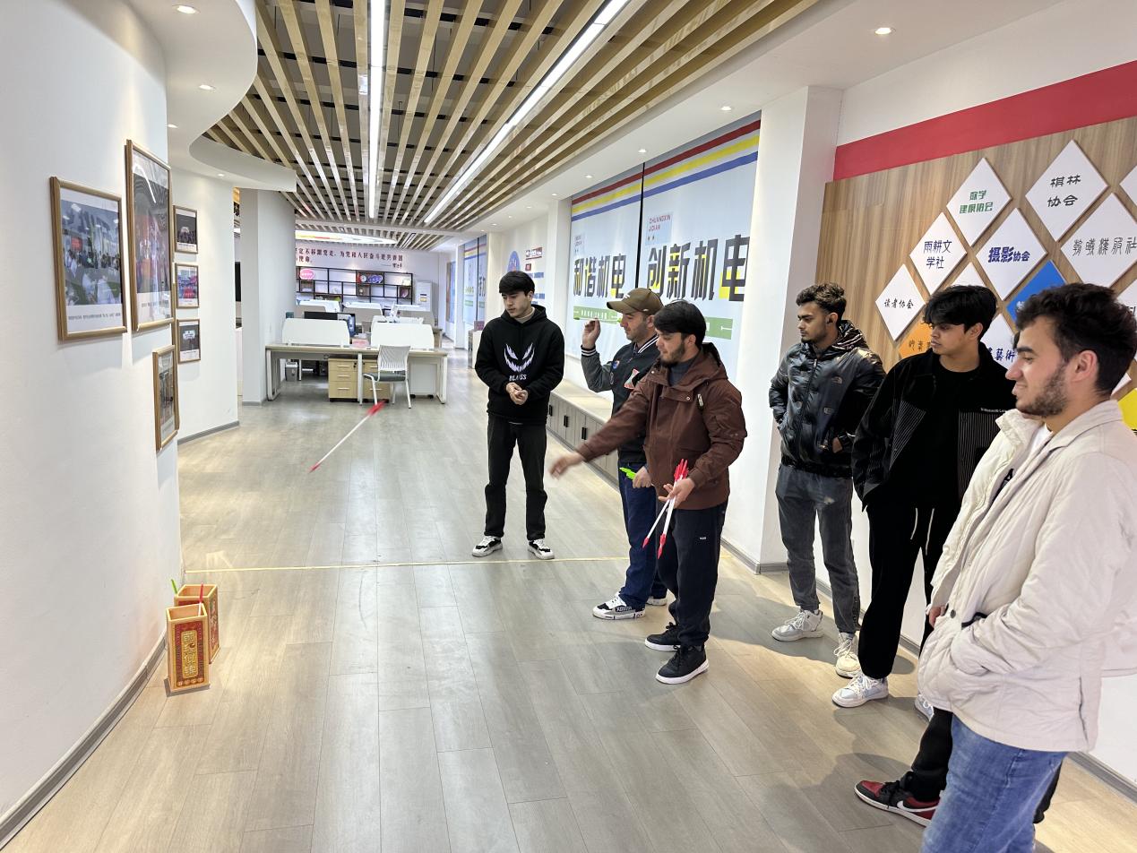 而活动中最激烈的莫过于投壶竞赛。在这场古老的传统游戏中,参与者们分组竞技,展现了各自的投壶技巧和团队合作精神。欢声笑语中,不仅增进了师生之间的情谊,也让国际学生们更好地融入了中国的节日氛围。