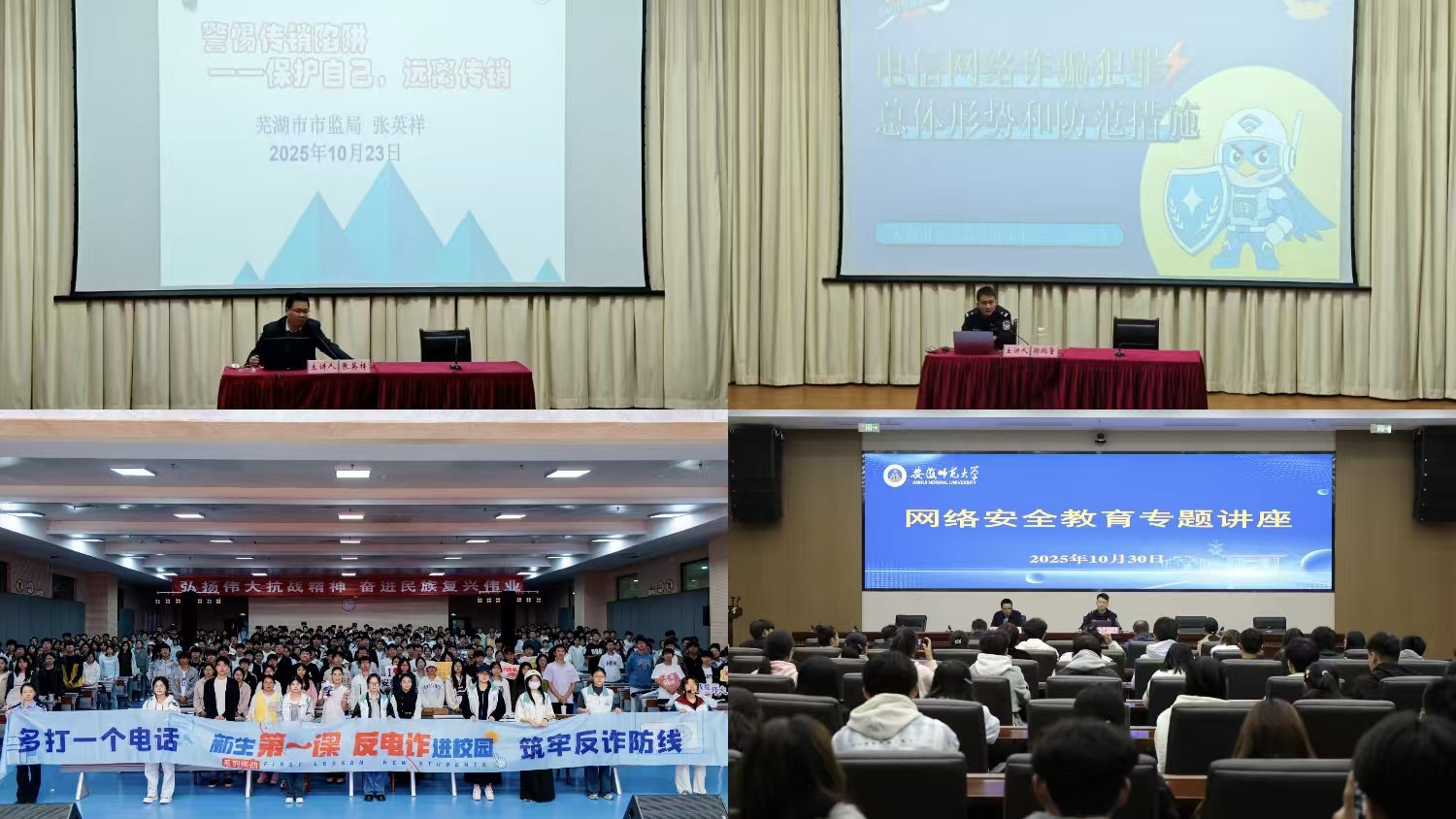 为提升新生网络安全意识与防诈骗能力,学校联合地方职能部门开展“安全课堂”,为新生普及安全知识。芜湖市公安局网络安全支队、市场监督管理局、弋江分局网络安全大队及反电诈中心的警官们,分赴两校区开展多场安全专题报告,主题涵盖“电信网络诈骗犯罪总体形势和防范措施”“网络舆情与谣言应对”等。警官们结合大学生群体中高发的“刷单诈骗”“校园贷”“冒充客服诈骗” 等案例,通过“以案说法+互动提问”的形式,拆解诈骗分子的作案套路,传授“三不一要”(不轻信、不透露、不转账,遇到疑问及时报警)等防范技巧。同时,警官们提醒新生要增强警惕性,妥善保护个人信息,共同维护清朗校园网络环境与学校声誉。