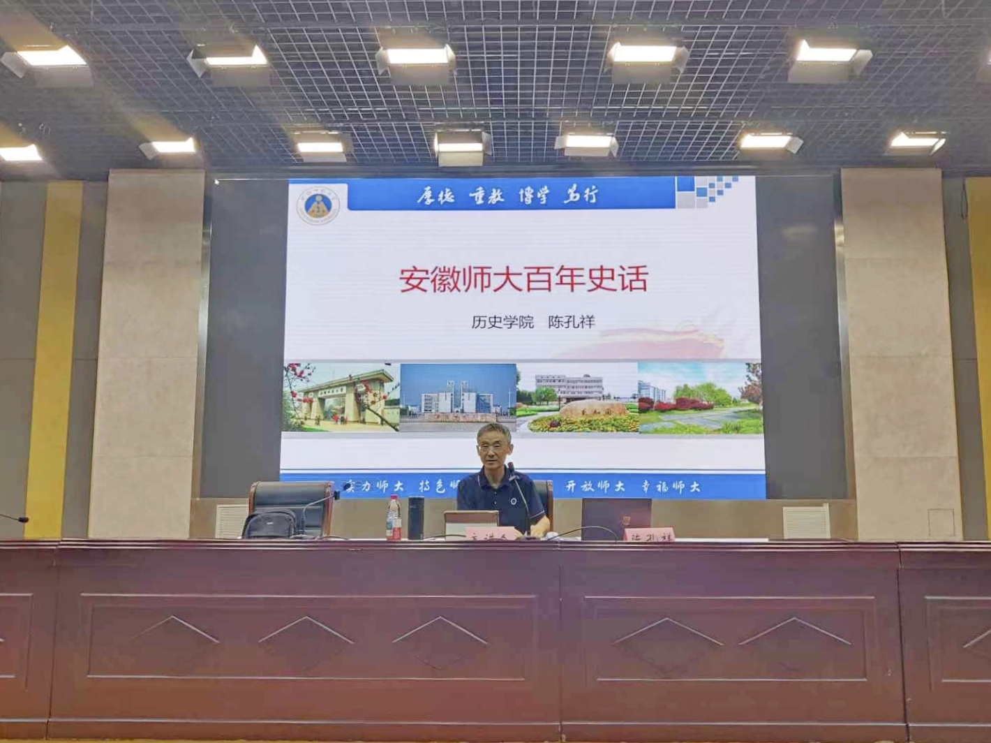 学校特邀历史学院陈孔祥教授,以“安徽师大百年史话” 为题开展校史专题讲座。陈孔祥教授依托丰富史料与生动案例,从“中国的百年大学”“安徽的百年名校”“师大的百年演变”三个维度,系统梳理了学校的办学脉络与发展历程。他通过讲述校史中的关键事件与代表性人物故事,生动展现了师大人“不畏强权、关爱学生”的精神品格,以及学校在艰难岁月中坚守学术、砥砺前行的坚韧底色,并殷切寄语新生:从校史中汲取奋进力量,传承师大精神,未来为学校发展贡献青春力量。