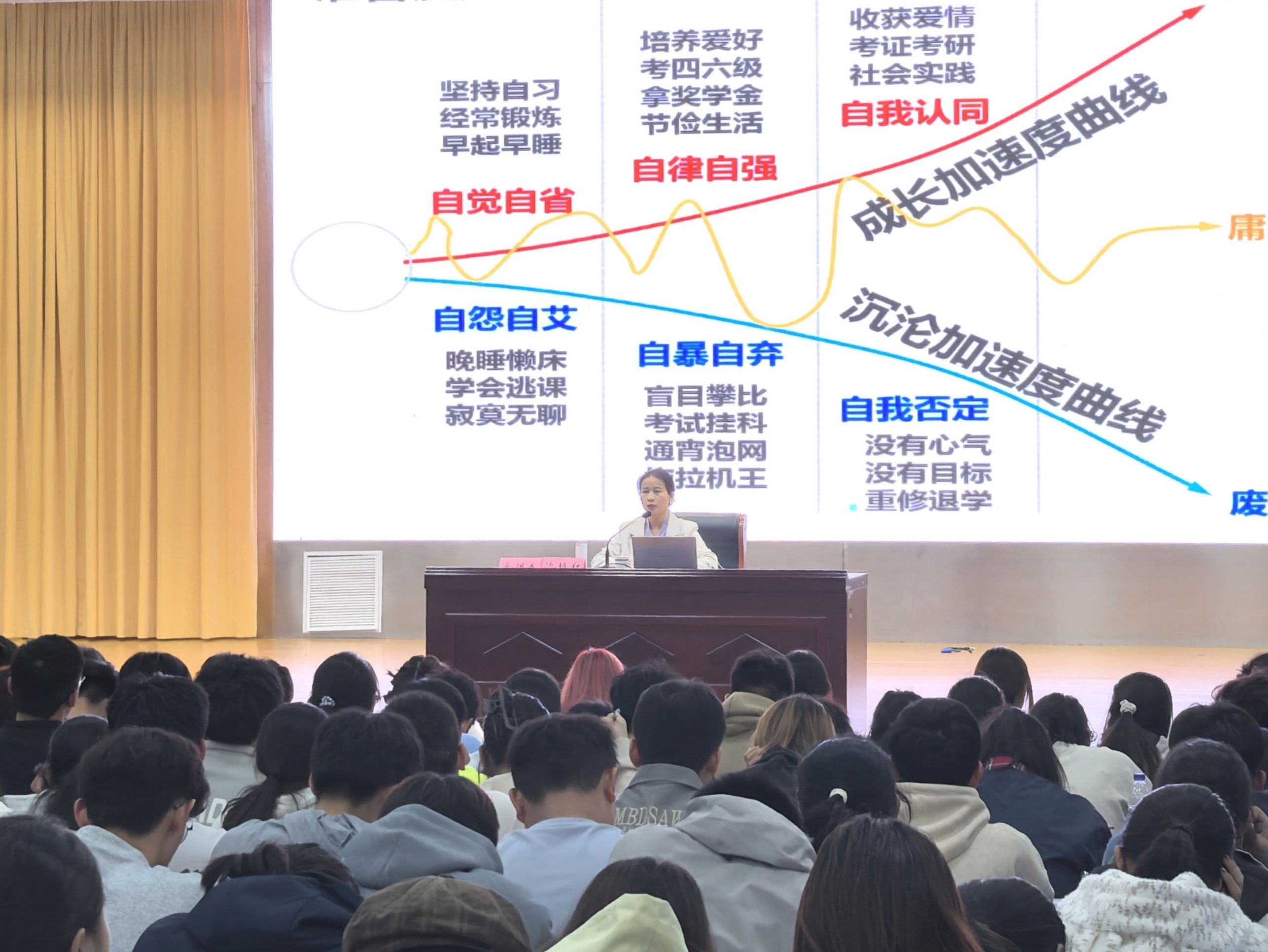 为全面掌握新生的心理状态,普及心理健康知识,增强新生的心理适应能力,校心理健康教育中心主任沈艳红以“新学期,‘心’成长”为主题做心理健康教育专题讲座。她以“成长加速曲线”与“沉沦加速曲线”为理论框架,阐述不同选择与心态对大学生活的影响,从“视角、纳悦、交往、资源”四个维度为新生提供全面发展的实施路径。同时,她详细介绍了校心理健康教育中心的师资团队、服务流程与硬件设施,鼓励新生在遇到心理困惑时主动求助,以开放、乐观的心态迎接大学生活的机遇与挑战。