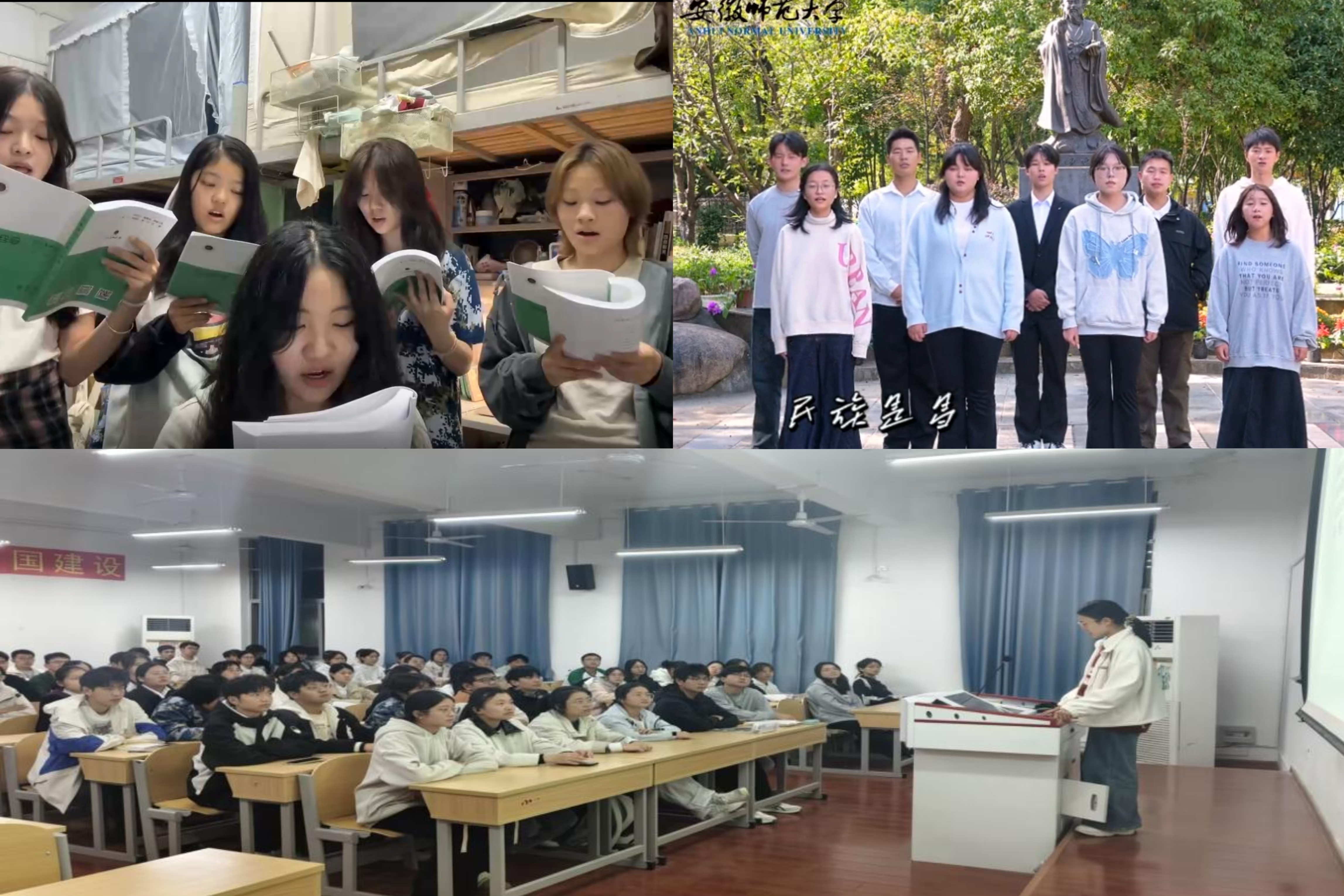 除专题报告外,学校同步开展 “校歌传唱” 主题教育实践活动,各学院通过主题党团日、主题班会、创意演唱视频等形式,结合自身特色创新形式,让校歌旋律回荡校园。经济管理学院通过主题班会解读校歌历史与内涵,再以集中教唱的形式,让新生在合唱中感受集体凝聚力与校园文化底蕴;音乐学院将校歌传唱延伸至学生公寓,以轻松的“宿舍合唱”形式,促进寝室成员间的交流与协作;天门山书院则将校园美景与新生活力相结合,拍摄校歌创意演唱视频,生动展现师大学子昂扬向上的精神风貌。通过校歌传唱,新生不仅熟练掌握了校歌旋律,更深刻理解了“厚德、重教、博学、笃行”的校训内涵,进一步增强了对学校的认同感与荣誉感。