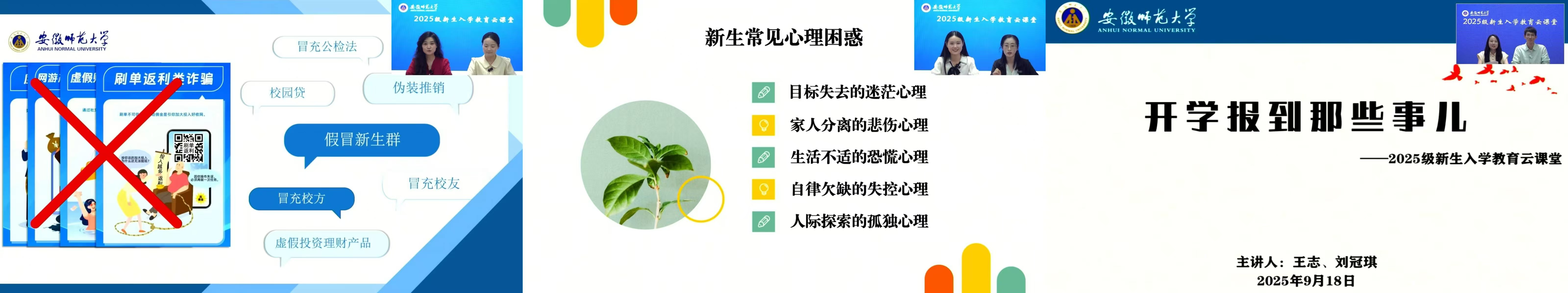 为帮助新生提前适应新角色、融入新环境,了解入学报到、校园生活等基本情况,在新生入学前,学校创新教育载体,开设“入学教育云课堂”,专门邀请经验丰富的辅导员通过网络直播开展专题指导。辅导员张玉楠与李梦圆围绕 “财产安全、交通安全、宿舍生活安全” 三大主题,结合案例讲解安全风险点,引导新生筑牢安全意识;辅导员金凤仙与杨玉婷聚焦“学业规划、人际交往、生活作息”,指导新生调整生活节奏,关注心理状态,提前适应大学集体生活;辅导员刘冠琪、王志以《开学报到 “那些事儿”》为题,详细讲解报到流程、宿舍入住、入学教育安排等实操内容,为新生顺利入学提供“指南”。