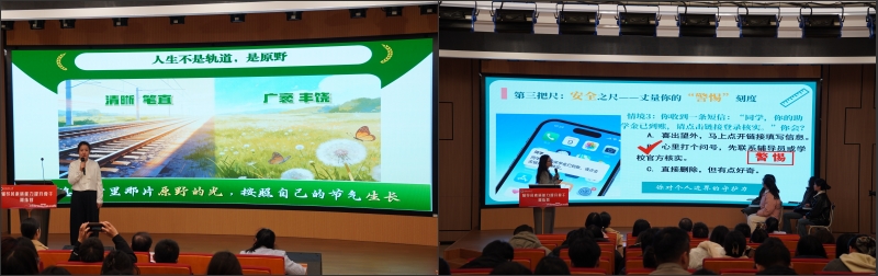 马克思主义学院辅导员陶娴静老师和地理与旅游学院辅导员韦银艳老师分别进行了微课和主题班会现场展示。陶娴静以“走出45º的人生,开拓你的原野”为主题,教导学生们认清自己的内心,选择奋斗的人生。韦银艳围绕“心间有尺,指尖有度”,给同学们明确了网络守界“信息”“表达”“安全”三把尺,并向学生们讲解了网络素养提升的重要性。随后,班宁对展评的微课和班会进行了点评,对微课和主题班会的成效表示了肯定,并指出辅导员工作需要更“接地气”,建议老师们在接下来的微课和班会准备阶段寻找更贴近学生现实的事例。
