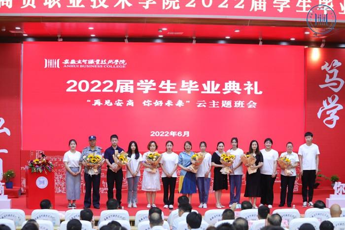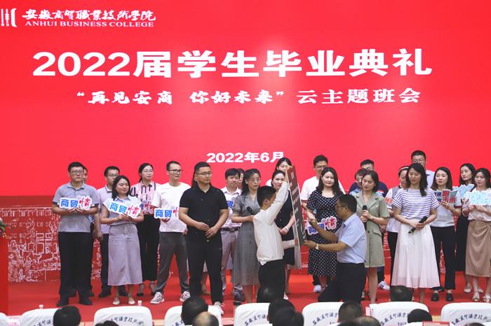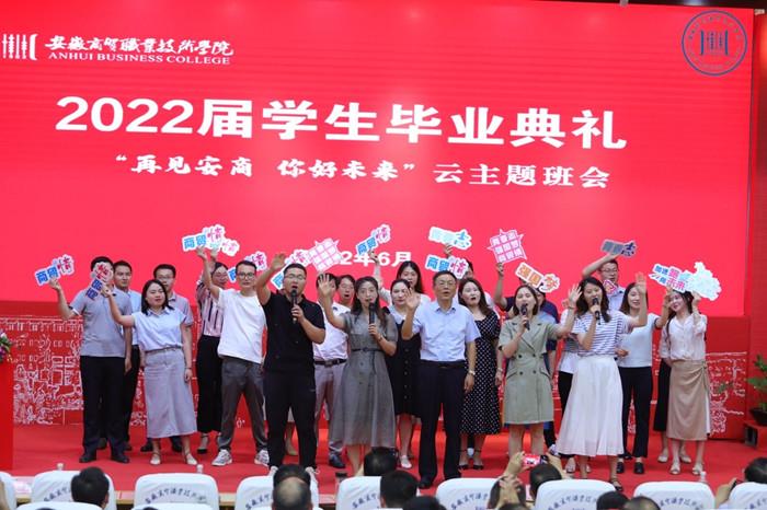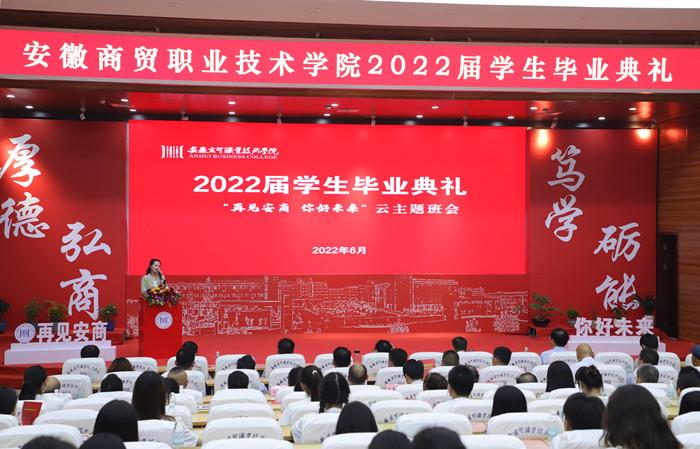 盛夏六月,万木葱茏,又是一年毕业季,又到一朝别离时。6月26日晚19:00,随着熟悉的上课铃声打响,安徽商贸职业技术学院以一场盛大的“再见安商 你好未来”云主题班会,深情送别新一届毕业学子。典礼在学校学术报告厅设线下会场,并通过学校官方微信视频号、抖音、bilibili平台同步直播,共吸引4.9万人次在线观看,获得超15万次点赞。校领导李忠、朱光应、郑承志、王炜出席线下毕业典礼,同毕业生代表、教职工代表、云端校友和家长们共同见证2022届学生毕业典礼的盛况。