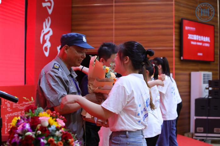 深情不及久伴,厚爱无需多言。仪式上,领导老师、医护人员、食宿阿姨、保安大叔用最朴实的语言和最真挚的情感向朝夕相处的同学们告别,毕业生代表为他们献上感恩之花,用一个深情的拥抱,感谢他们三年来的悉心照料。