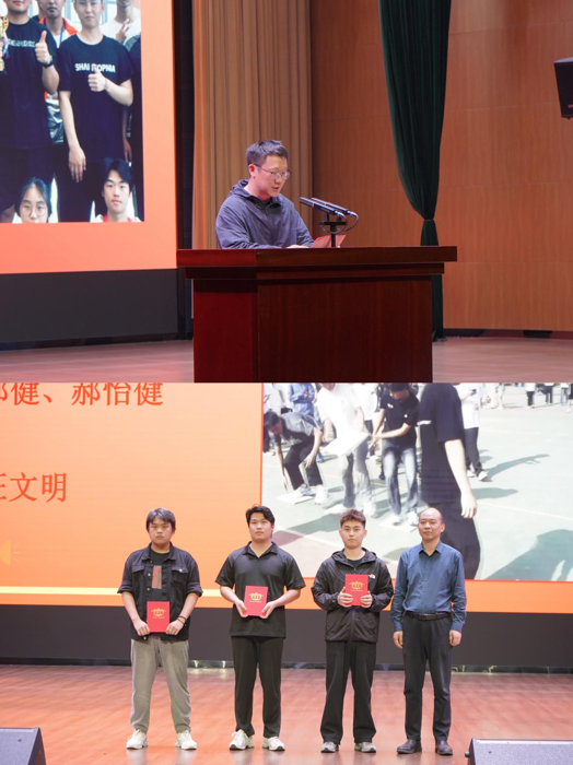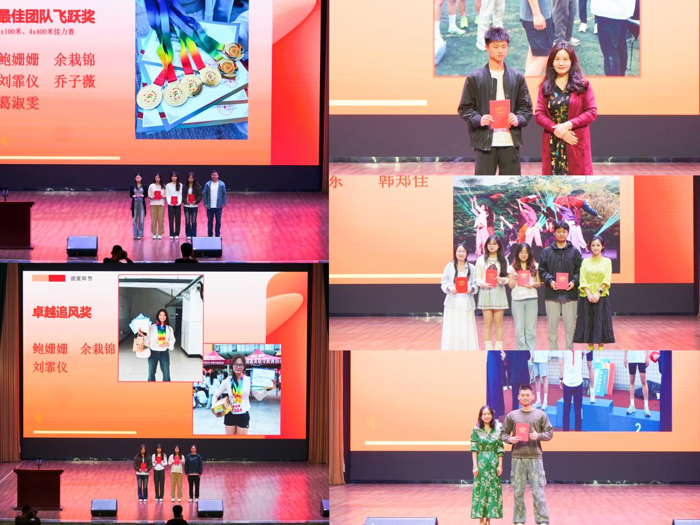 学院院长夏名首等领导为优秀健儿颁奖。大家仿佛又看到了鲍珊珊同学面对一天五枪的坚韧、刘霏仪同学与破纪录擦肩而过的遗憾和明年再战的决心;拔河队的同学们在体力不支时咬紧牙关、坚持到底的毅力,以及像汤强这样有梦想、有担当的同学站出来为班级、为学院争光时的决然。
